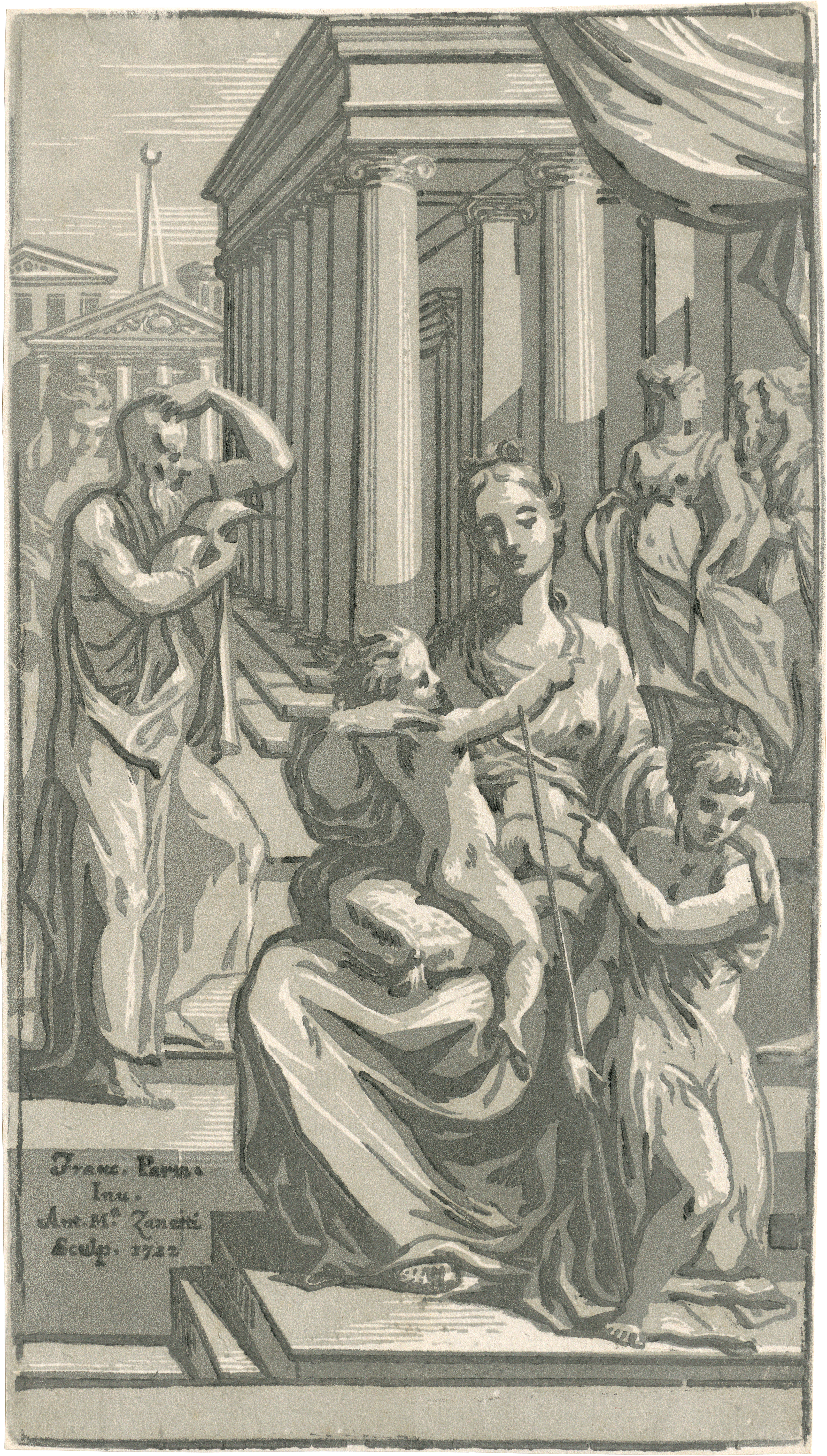 Die Madonna mit dem Kind und dem Johannesknaben vor einem Tempel. Clair-obscur-Holzschnitt von drei Blöcken in Graugrün, nach Parmigianino. 25 x 14,1 cm. 1722. B. 34 III. Wz. Tre Lune (Untersatzpapier).