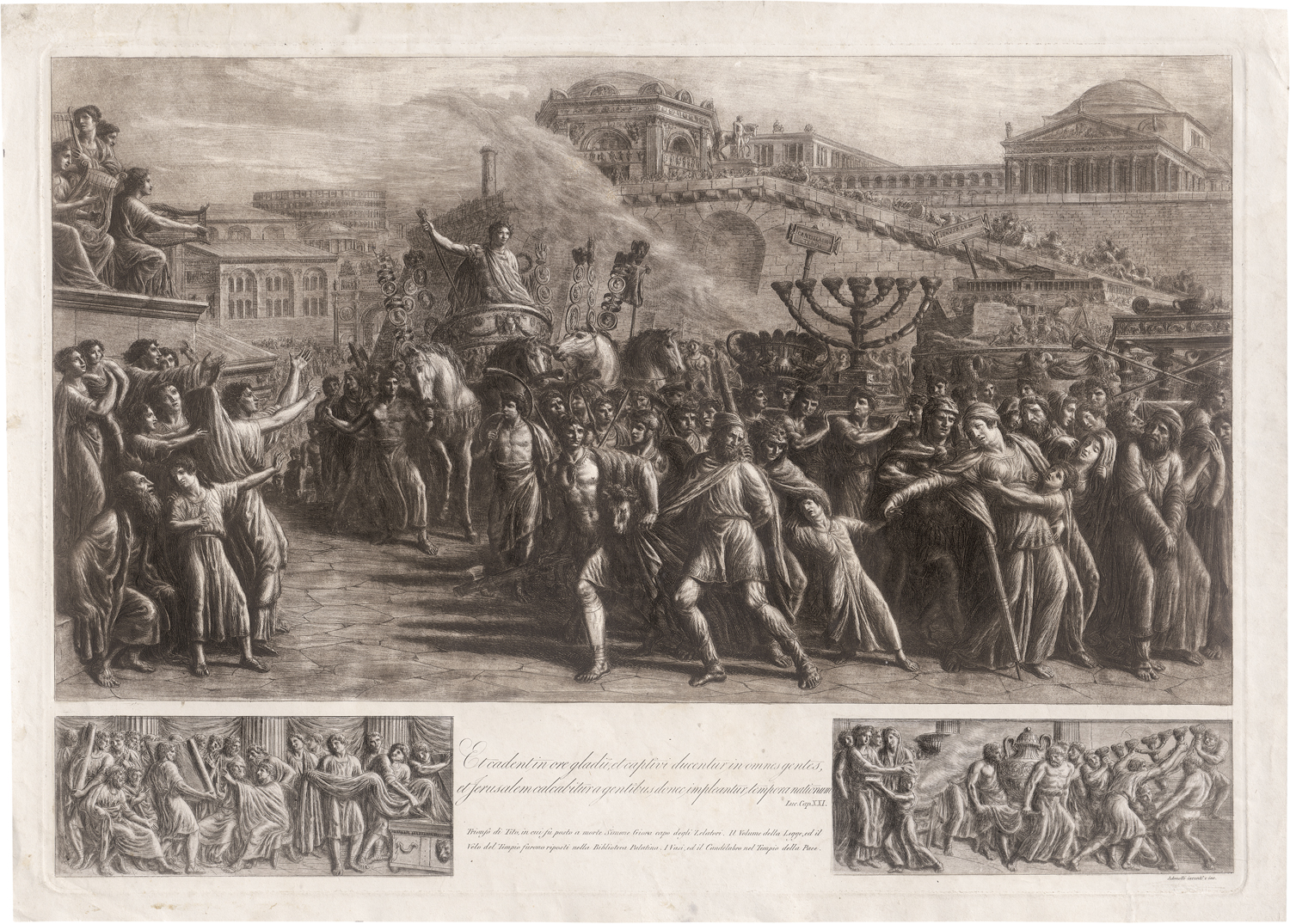 Ademollos imposantes druckgraphisches Werk entstand im Zeitraum 1794 und 1837. Die sechs Szenen illustrieren Episoden aus der Einnahme und Zerstörung Jerusalems durch die Römer, jeweils mit zwei kleinen ergänzenden Szenen unten und Zitaten aus den Evangelien Lucas und Matthäus: Das römische Heer vor den Mauern Jerusalems „Cum autem videritis circumdari…“; Jerusalem von den Römern eingeschlossen, „Et circundabunt…“; Der Brand des Tempels in Jerusalem, „Erit enim tunc tribulatio…“; Der Wiederaufbau des Tempels wird durch Erdbeben und Feuer verhindert, „Haec quae videtis…“; Titus belohnt die Soldaten nach der Zerstörung Jerusalems, „ Et ad terram prosternent…“; Der Triumph des Titus, „Et cadent in ore gladii…“. Ganz ausgezeichnete, gegensatzreiche Drucke mit schmalem Rand. Teils etwas fleckig und faltig, leichte altersbedingte Gebrausspuren und Erhaltungsmängel, der Gesamteindruck jedoch gut. Selten.