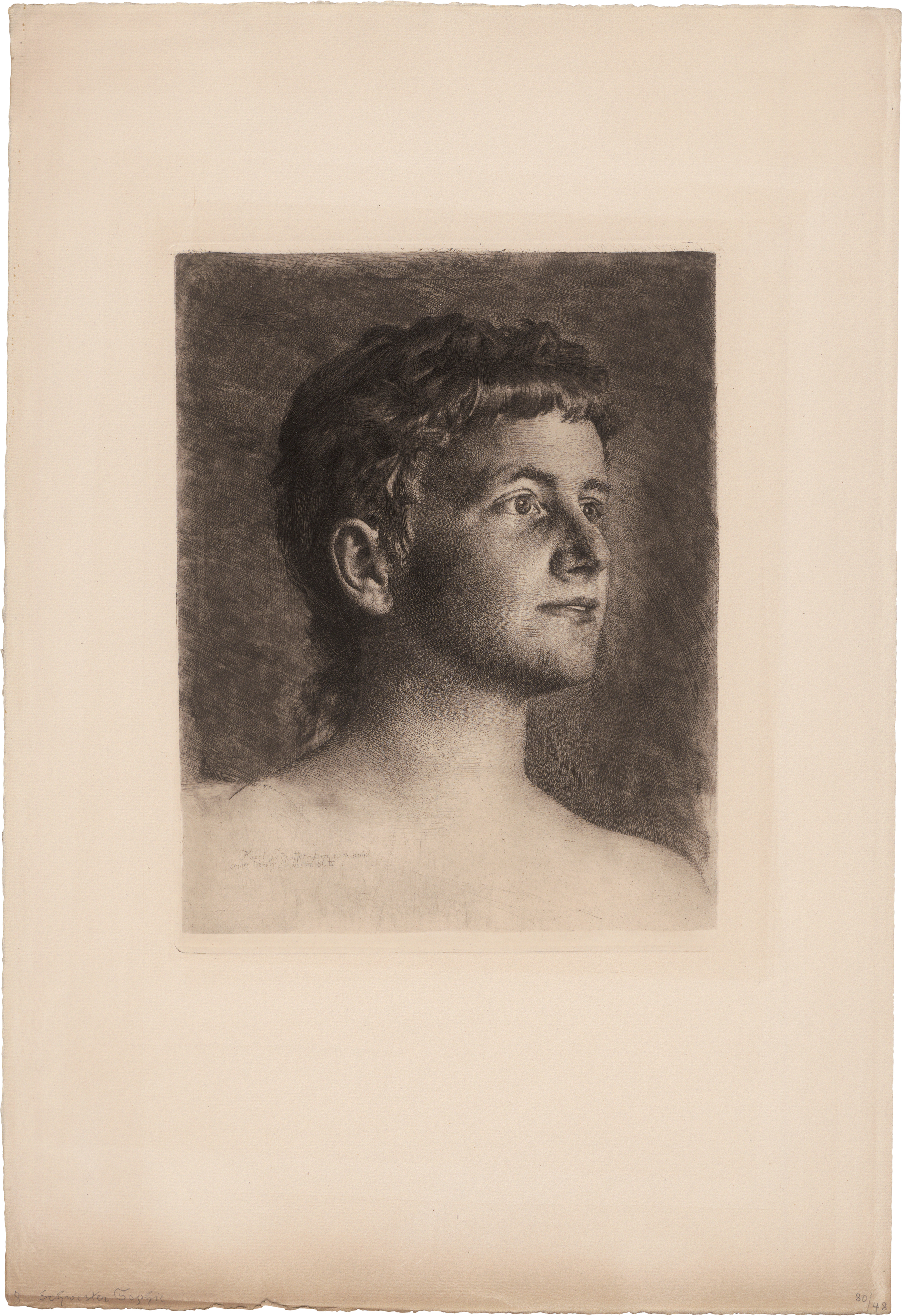 Sophie Stauffer, die Schwester des Künstlers. Radierung in Braunschwarz auf festem van Gelder Zonen-Bütten. 31,6 x 24,6 cm. 1885-1886. Lehrs 8 VIII-IX (von IX). Wz. Großes bekröntes Lilienwappen.