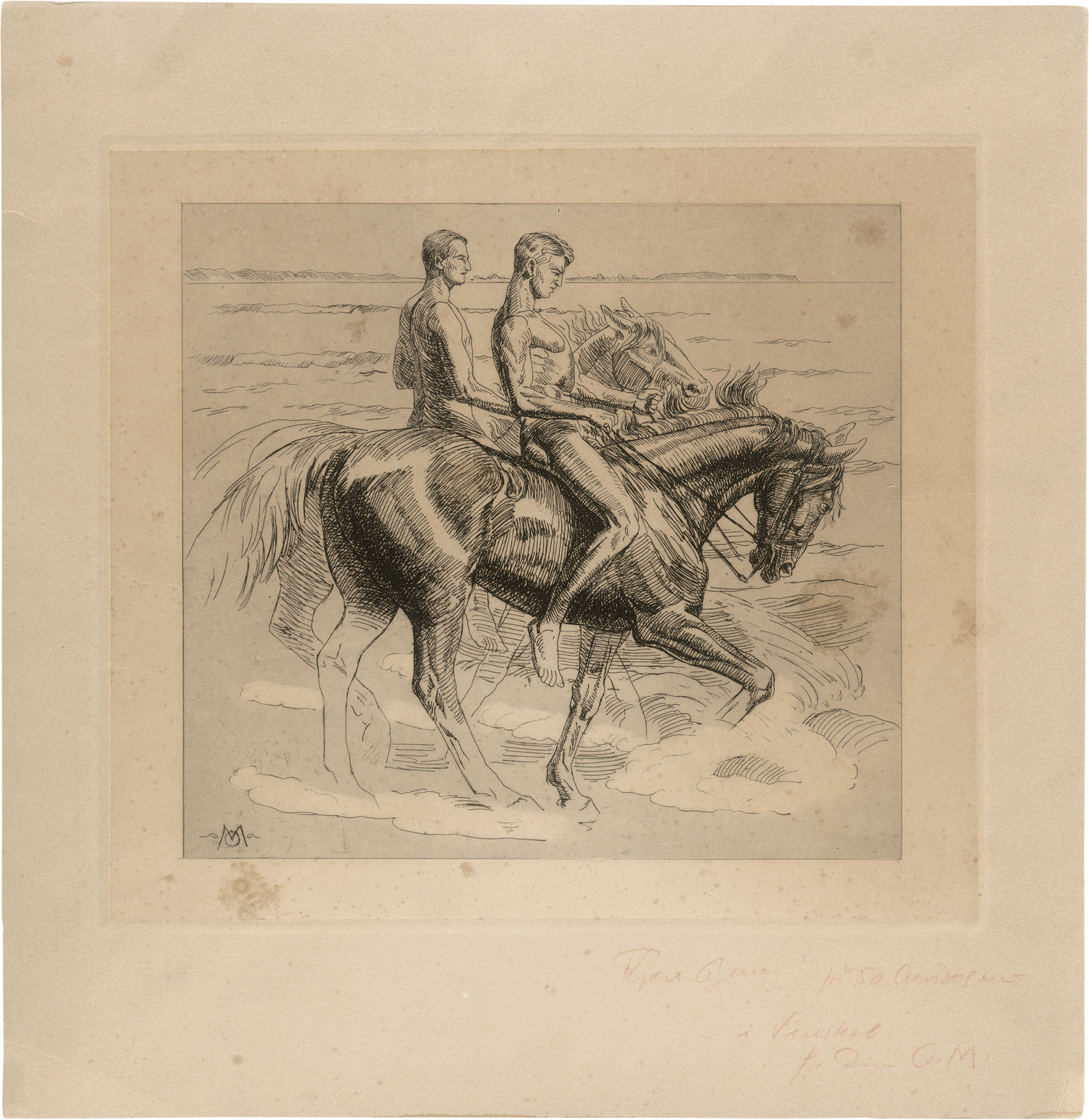 Die Radierung entstand im Zusammenhang mit Oscar Matthiesens monumentalem, gleichnamigen Gemälde, das im Jahr 1906 entstand und beeindruckende Maße von 4,6 auf 10 Metern aufweist. Das Werk gehört zum Bestand des Nationalmuseums in Stockholm und befindet sich ausgesetllt im Ystad Kunstmuseum. Der dänische Künstler kam während eines Urlaubs im südschwedischen Ystad im Jahr 1904 auf die Idee zu diesem Motiv. Ystad beherbergte damals das größte vereinigte Kavallerieregiment Europas, was der Stadt einen prägenden Stempel aufdrückte. Matthiesen ließ sich nach eigenen Angaben von den jungen Soldaten, dem Sonnenlicht, dem Salzwasser sowie von der Kraft der Körper von Mensch und Tier inspirieren. Die meisten der dargestellten Männer sind porträtierte Offiziere, die zur Entstehungszeit des Gemäldes beim Dragonerregiment in Ystad dienten. In der vorliegenden Graphik ist jedoch nur ein Ausschnitt mit zwei Reitern aus dem Gesamtwerk zu sehen. Bei dem Reiter im Vordergrund wird vermutet, dass es sich um den Sohn des Künstlers handelt. Ganz augezeichneter Druck mit schönem Plattenton und mit Rand. Gebräunt und stockfleckig, die weißen Ränder bzw. Eckspitzen leicht bestoßen, sonst gut erhalten. Selten.