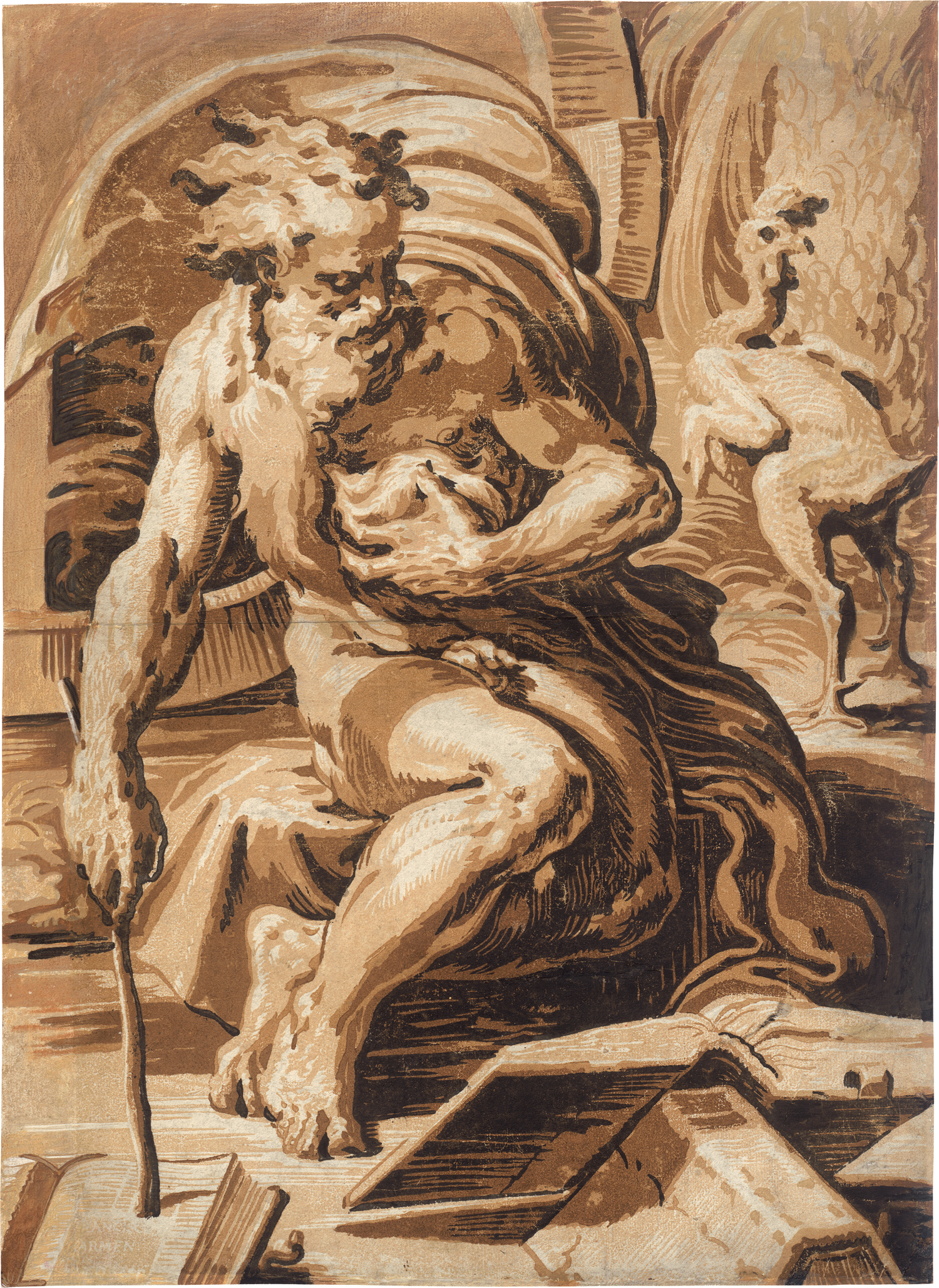 "Suivant Vasari (p. 422) Hugues de Carpi n'a rien fait de plus beau que ce clair-obscur de quatre planches [...]." (Bartsch). Ganz ausgezeichneter, farblich subtil abgestufter Druck, entlang der Seiten, jedoch vor allem links und oben unter Darstellungsverslust beschnitten. Dort sehr sorgsam angerändert und mit versierten Farbretuschen ergänzt, einzelne ausgebesserte Papierläsuren und Erhaltungsmängel, horizontale Mittelfalte, beriebene Stellen, weitere Alters- und Gebrauchsspuren, der Gesamteindruck gleichwohl sehr schön.