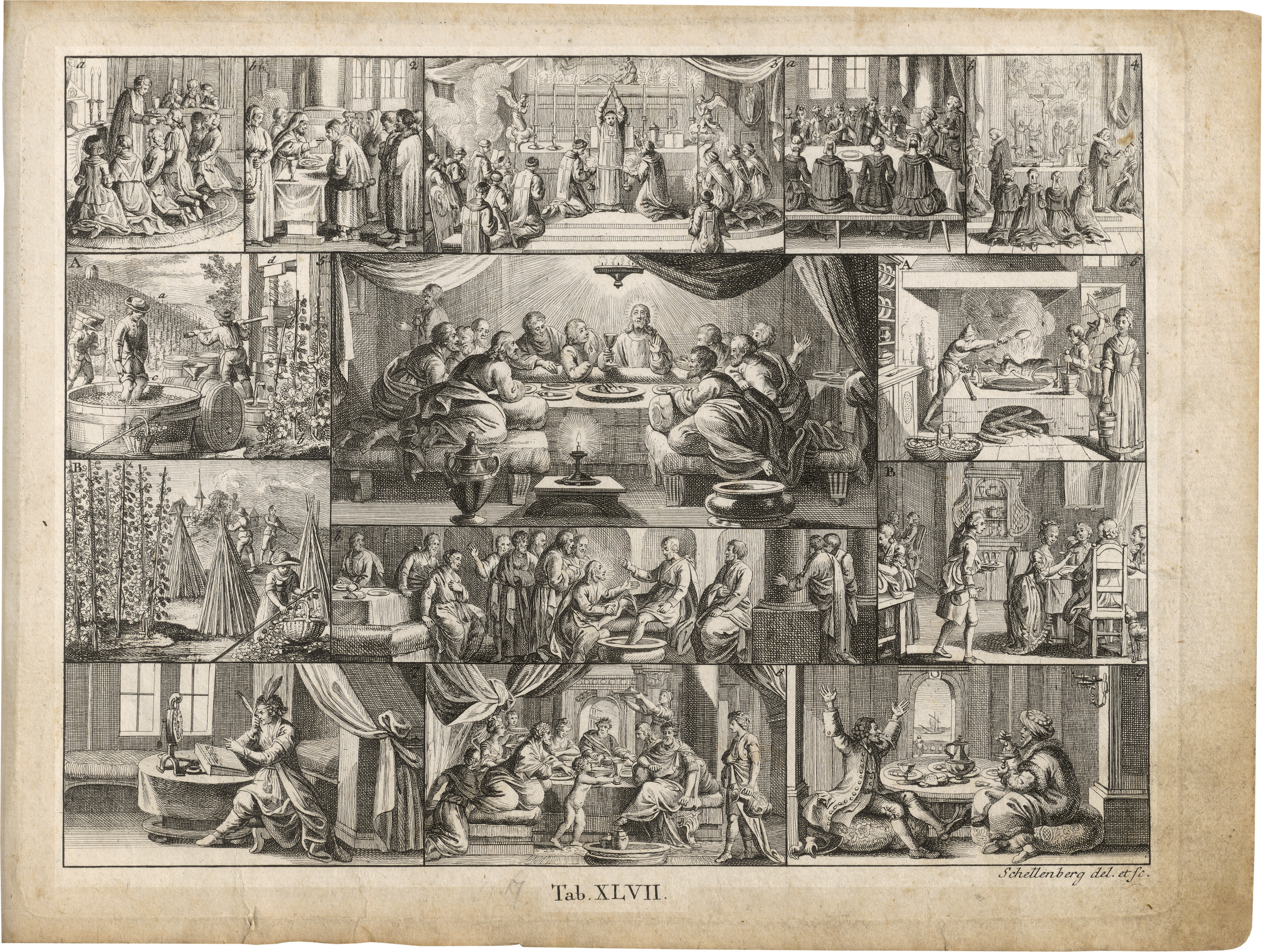 Stoys Bilder-Akademie war ein an Basedows Elementarwerk orientiertes, enzyklopädisches Bilderlehrbuch für Jungen und Mädchen bis 12 Jahren. 1780 bis 1784 in Einzellieferungen erschienen, wurde der hier vorliegende Tafelband durch zwei Textbände ergänzt. Die wöchentlich zu lernenden Bildtafeln zeigen jeweils Darstellungen aus neun verschiedenen Themenbereichen, Religion, Naturlehre, Kunst, Berufsleben und weiteren. Im zentralen Bildfeld steht eine biblische Geschichte, die den Ausgangspunkt für alle anderen Illustrationen bildet und mit der die Lehre stets begonnen werden sollte. Die Tafeln entstanden nach Zeichnungen von Daniel Nikolaus Chodowiecki, seines Bruders Gottfried sowie der beteiligten Stecher. Das vollständige Werk in ausgezeichneten Drucken mit schmalem Rand, zwei Blatt auf die Darstellung beschnitten und auf ein Bütten montiert, angeschmutzt, fleckig, Ränder bestoßen, teils mit Läsuren, ausgebesserten Stellen und kleinen Papierverlusten in den Rändern und Ecken, noch gut.