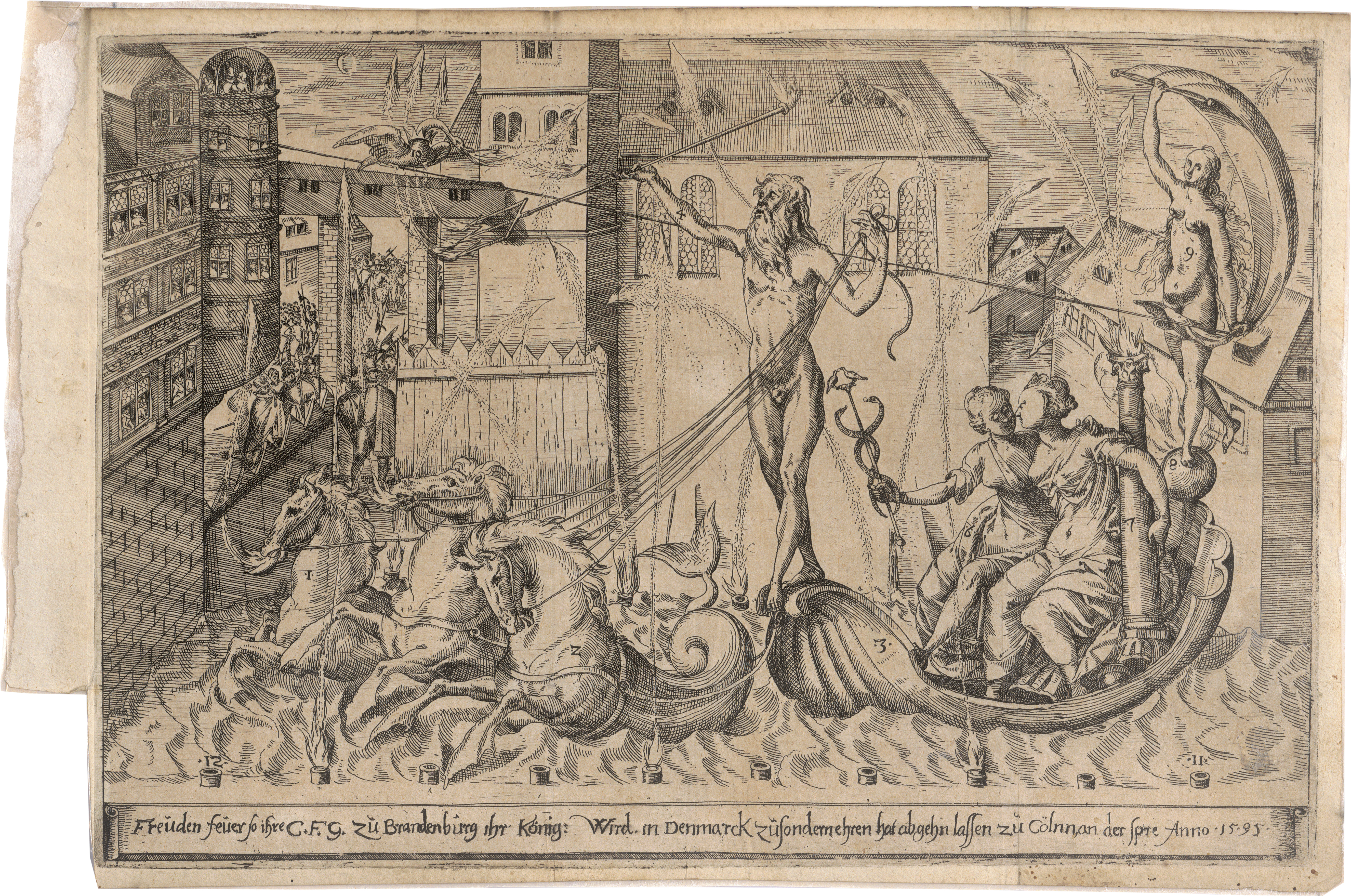 Im Jahr 1595 stattete König Christian IV. von Dänemark der Mark Brandenburg einen Besuch ab und traf sich mit Kurfürst Johann Georg in Berlin. Ganz ausgezeichneter Druck mit feinem bis schmalem Rand um die Plattenkante, links unten bis an diese geschnitten. Etwas vergilbt und fleckig, verso Falzspuren, weitere Gebrauchsspuren, entlang der äußeren Ränder mit alten Kleberesten, sonst gut.