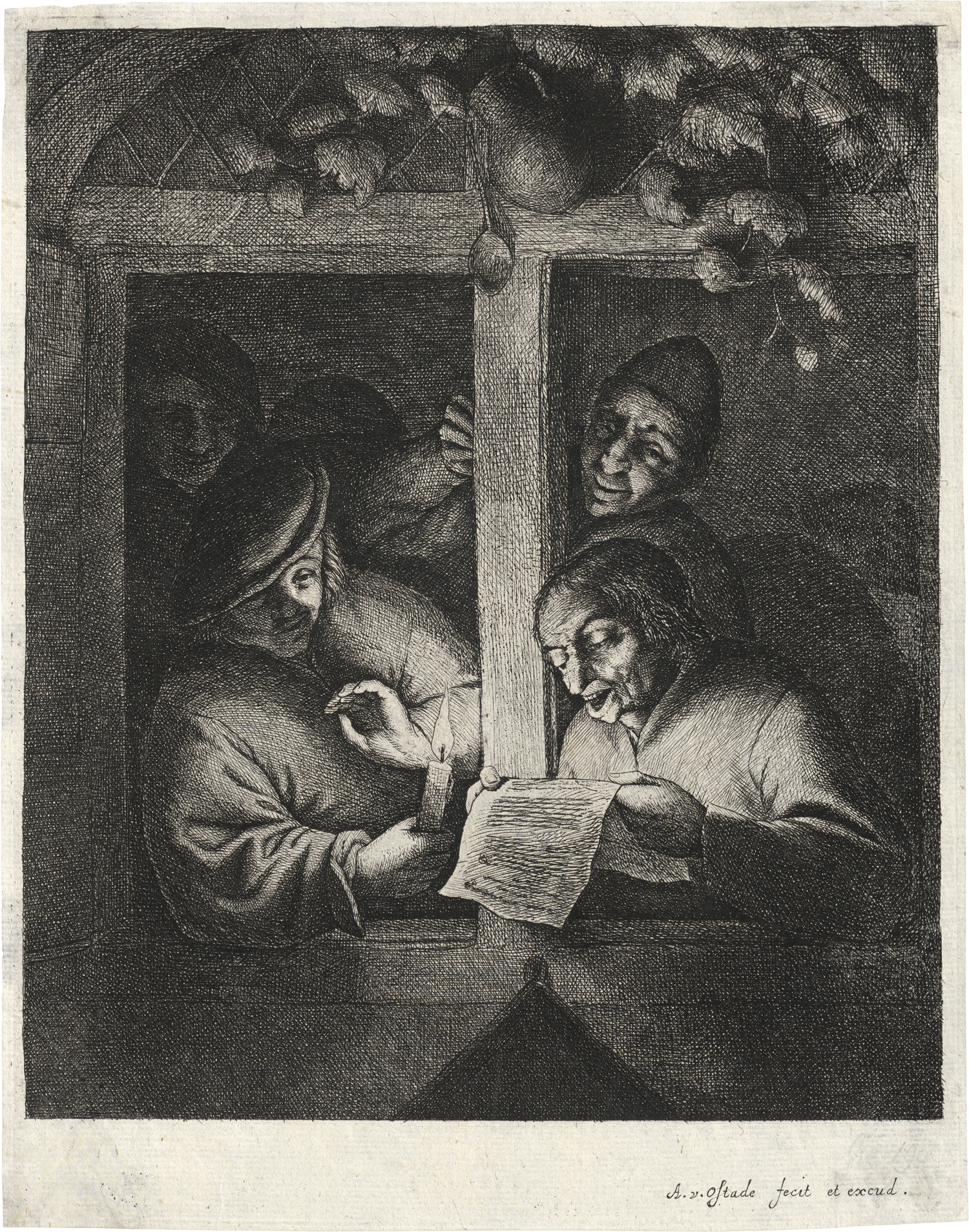Die Sänger am Fenster. Radierung. 23,9 x 19,2 cm. Um 1667. B. 19, Dutuit, Davidsohn, Godefroy, Hollstein 19 V (von VII), Giordani/Rutgers (New Hollstein) 36 VI. Wz. Traube.