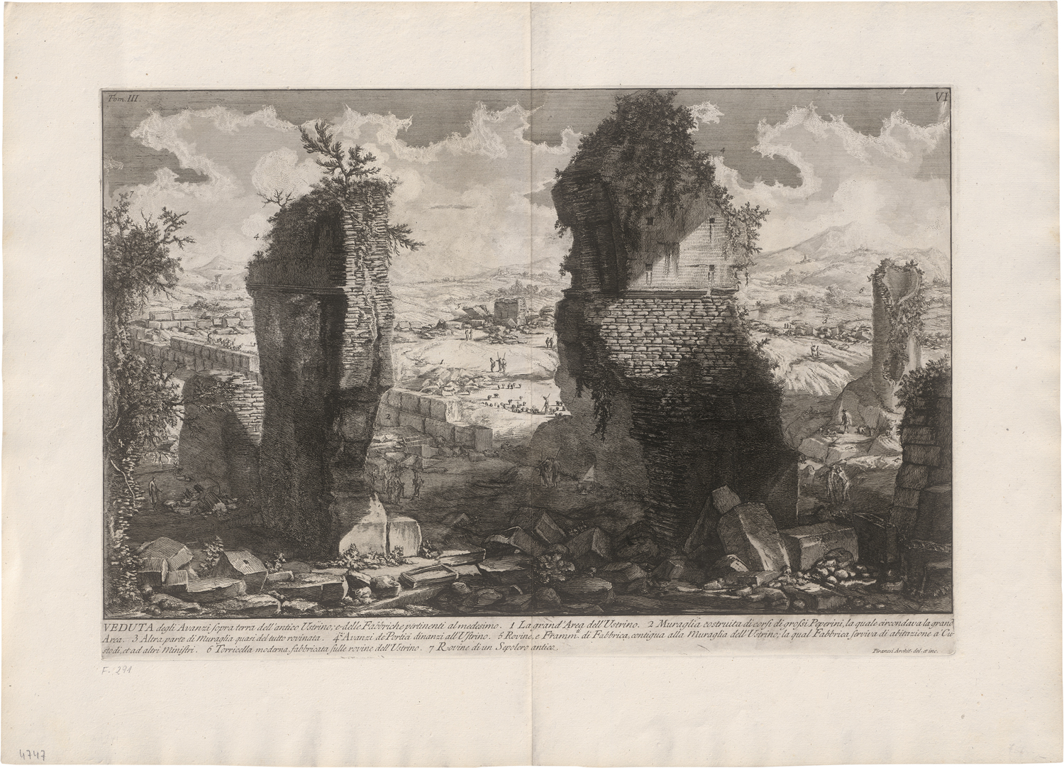 Blatt VI des dritten Bandes der Folge der Antichità Romane. Ganz ausgezeichneter Druck mit breitem Rand. Übliche vertikale Mittelfalte, Etwas angestaubt und vereinzelte Fleckchen, die Ränder leicht bestoßen und mit Spuren von Rotschnitt, sonst sehr schön. Beigegeben von demselben aus der Folge "Varie Opere" die Radierungen "Rovine d'archit.a Egiziana e Greca" (Focillon 132), "Pars Residua Porticum" (Focillon 467) sowie zusammen auf einem Bogen gedruckt "Scuola antica architettata all' Egiziana e alla Greca" (Focillon 128) und "Portici tirati ad un Foro" (Focillon127).