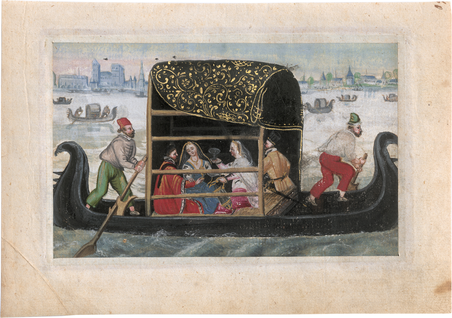 1593. Elegante Gesellschaft in einer venezianischen Gondel