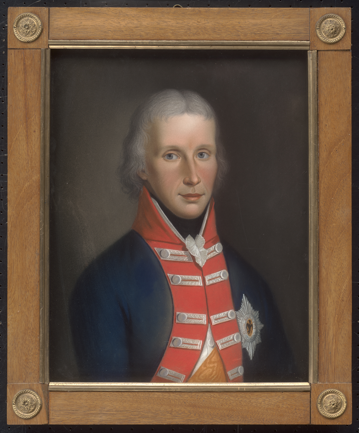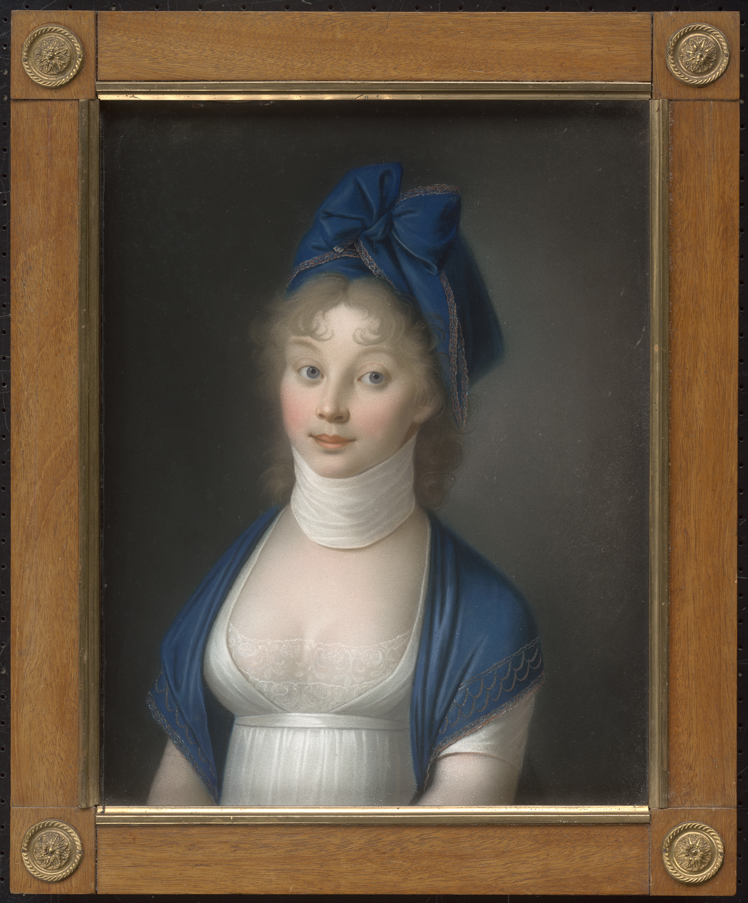 Als die mecklenburgische Prinzessin Luise 1793 als Verlobte des preußischen Kronprinzen in Berlin ankam, war der Grundstein zu ihrer bis heute anhaltenden verklärten Popularität, ja kultischen Verehrung, gelegt. Doch darf über diese Mythisierung nicht vergessen werden, dass sich Luise im Gegensatz zu ihrem zaudernden Ehemann Friedrich Wilhelm III. auch als weitsichtige Politikerin auszeichnete. In den Jahren napoleonischer Expansion und preußischer Zögerlichkeit setzte sie sich entschieden für ein Bündnis mit Russland und Österreich ein, suchte und verhandelte mit Bundesgenossen und förderte nach der schmachvollen Niederlage Preußens maßgeblich fortschrittliche Reformer. Aufgrund ihrer Beliebtheit entbrannte über alle Stände hinweg eine große Nachfrage nach Porträts der jungen Monarchin. Am Hofe erkannte man, dass sich mittels einer gesteuerten Bildproduktion die Außenwirkung des preußischen Königshauses beeinflussen ließe. Einfache, lebensnahe Inszenierungen und der Verzicht auf Herrschaftszeichen sollten das Bild einer bürgernahen, progressiven Monarchie zeichnen. Diese Nachfrage bediente unter anderem der Künstler Nikolaus Lauer mit Werken von herausragender Qualität. Lauer hatte seit 1791 eine Stellung als Hofmaler beim Pfalzgrafen von Birkenfeld-Zweibrücken inne, doch zwang ihn das Vorrücken der napoleonischen Truppen 1794 zum Umzug nach Leipzig und Dresden. Aus dem Jahr 1799 hat sich eine Zeitungsannonce erhalten, in der Lauer seine Bildnisse des preußischen Königspaares ankündigt. Von den vorliegenden Brustbildnissen sind mehrere eigenhändige Fassungen bekannt (vgl. Thomas Wiercinski: Der Pastellmaler Nikolaus Lauer. 1753-1824. Werkverzeichnis, St. Wedel 2004, Kat. 54-59, 63, 68, 70). Die Urfassung von Luises Porträt, das die Königin modisch gekleidet in einem weißen Chemisekleid mit der ikonischen Halsbinde sowie einem Schal und Kopftuch in tiefem Blau zeigt, hing in Schloss Monbijoux und gilt als kriegsbedingter Verlust. Eine engverwandte Version ist heute im Schloss Pfaueninsel zu sehen (SPSG, GK I 40618).
