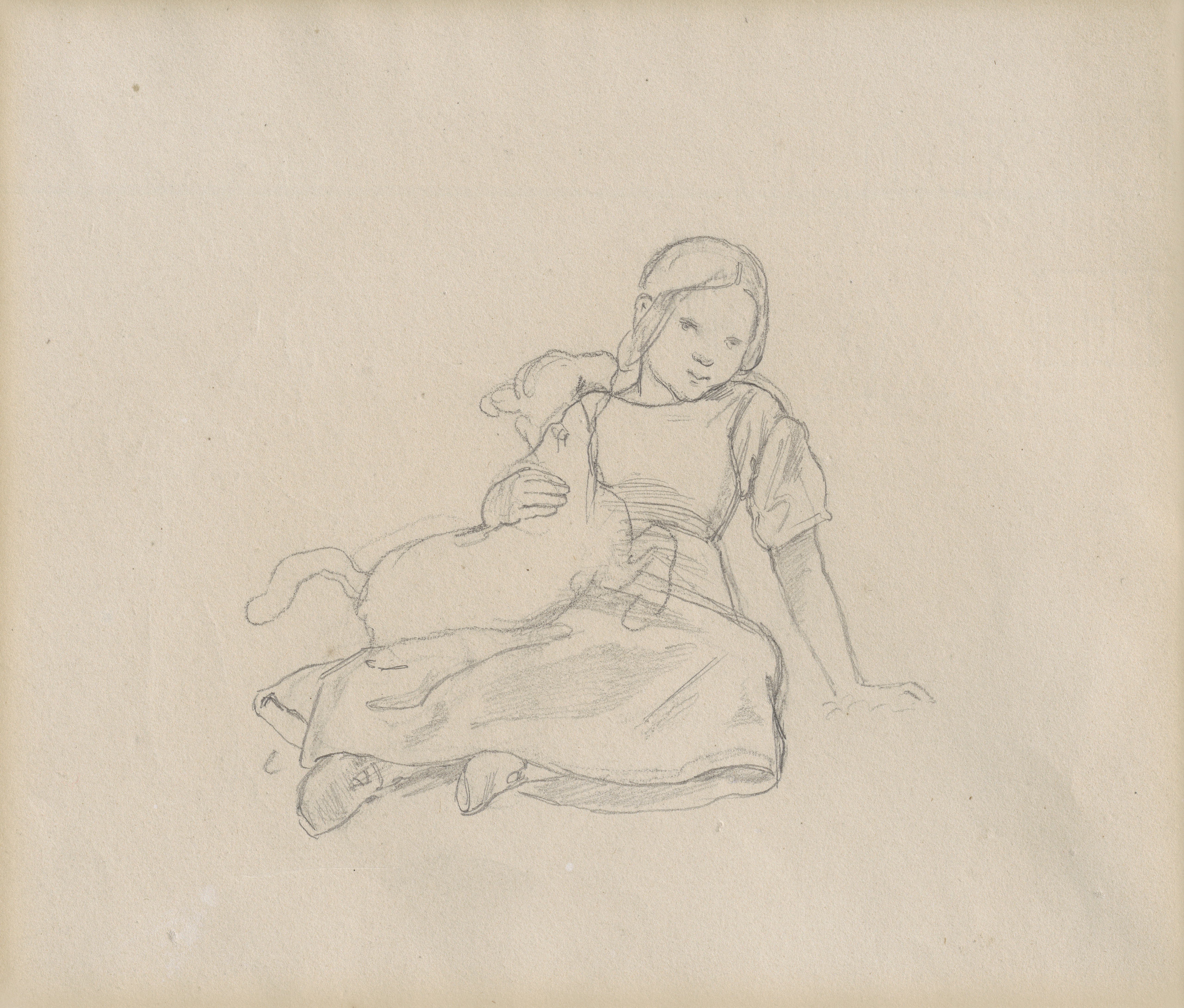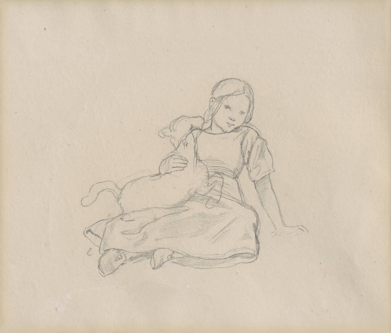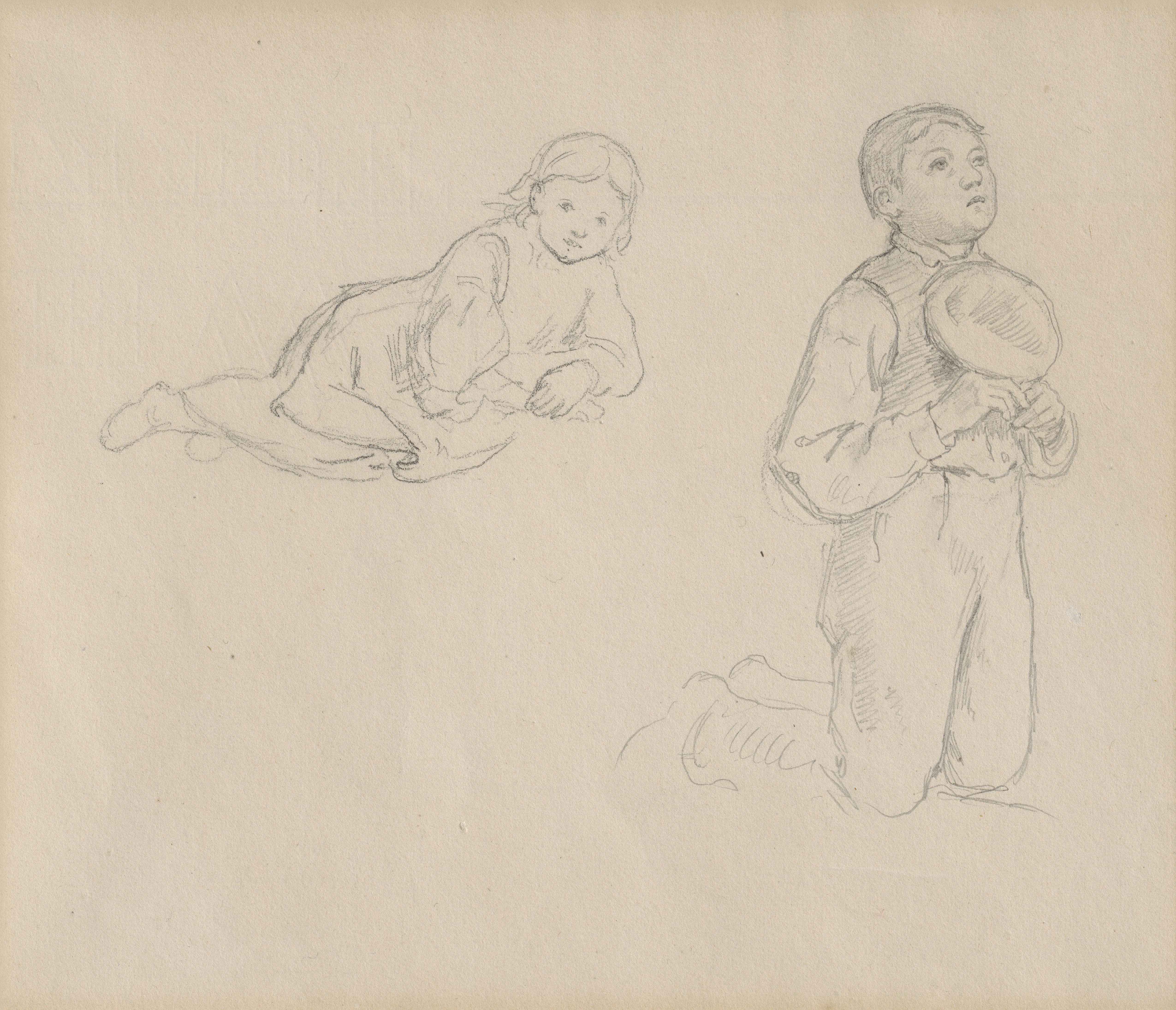 Junges Mädchen mit Lämmlein; Junge bei Andacht und liegendes Mädchen - Figurenskizzen für das Gemälde "Abendandacht".