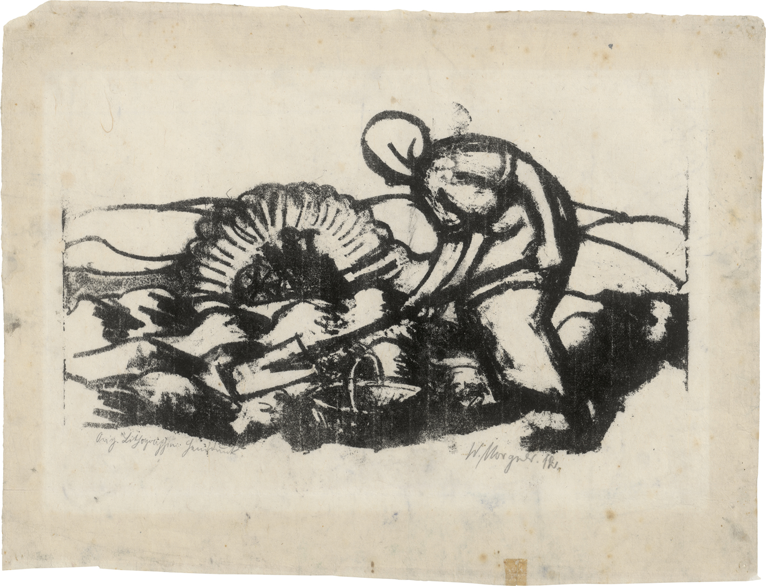 Rarität von beeindruckender Präsenz. In archaischer, fast schroffer Vereinfachung gestaltet Morgner die Gestalt der Erntenden in einer weiten Feldlandschaft. Er fragmentiert den Bildraum in helle und dunkle Flächen, so dass Figur und Natur miteinander zu verschmelzen scheinen. Um 1912 findet der Künstler von der Abstraktion zurück zur Gegenständlichkeit. Durch Morgners Einberufung zum Militär 1913 und den Kriegsdienst bis zu seinem frühen Tod entstanden keine weiteren druckgraphischen Arbeiten. "Morgners graphische Arbeiten zeugen von seiner eigenwilligen und eigenständigen künstlerischen Persönlichkeit (...). Daß Morgner trotz seiner Jugend bereits zu den bekannten Künstlern der Zeit gehörte, wird durch die Ausstellungsbeteiligungen, sowie, für die Druckgraphik besonders aufschlußreich, durch die zahlreichen Veröffentlichungen seiner Holz- und Linolschnitte in den Zeitschriften 'Der Sturm' und 'Die Aktion' belegt." (Andrea Witte, in: Wilhelm Morgner. Graphik (Werkverzeichnis), Soest 1991, S. 15). Prachtvoller und kräftiger, dennoch sehr schön nuancierter Handabzug mit Rand. Es handelt sich hier um eine von nur vier bekannten Lithographien Morgners. Eine Auflagenhöhe ist nicht bekannt. Von allergrößter Seltenheit.