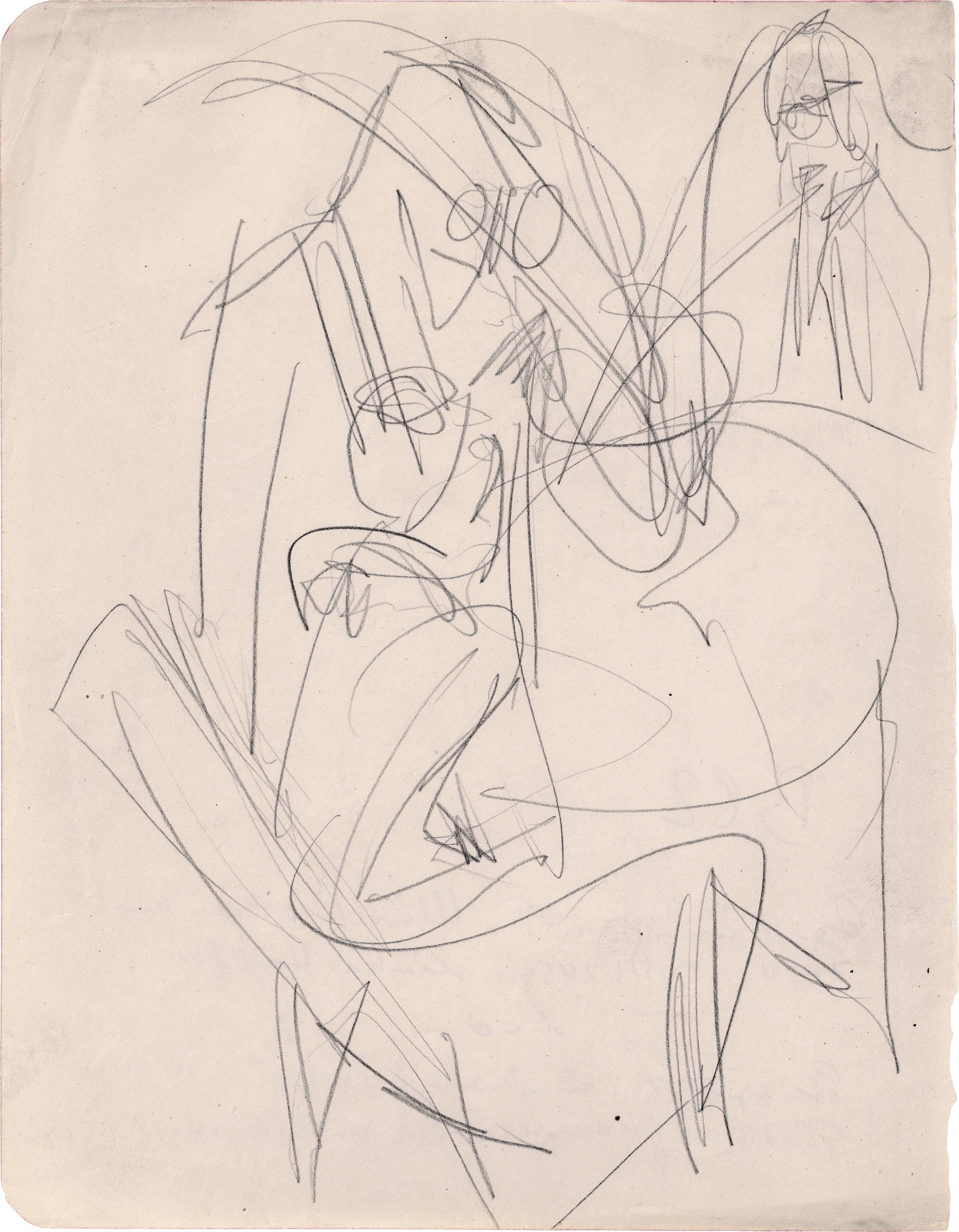 Kirchners 1914 entstandene Lithographie "Musikrestaurant" (Gercken 666) zeigt im linken Bildteil eine weitgehend der vorliegenden Skizze ähnelnde Figurengruppe um den runden Tisch gruppiert. Verso bezeichnet "Zeichnung zu 'Musikrestaurant' 1914 D. L 245 linke Hälfte und Skizze 2 zu 'Kaffeehaus' 1914 G 373 (Kompilation mit Skizze 1 (81)". Das Blatt ist einem frühen Skizzenbuch des Künstlers entnommen, links mit dessen gerundeten Ecken. Es stammt, wie auch die Kat.-Nrn. 7052 und 7053, aus dem Besitz der Schweizer Textilkünstlerin Lise Gujer, die mit Kirchner eng zusammenarbeitete. In den Skizzenbüchern 3,10,15,16,18,1920, finden sich thematische Parallelen. Im „Davoser Tagebuch“ schreibt Kirchner über die „feinste erste Empfindung“, die das Skizzenbuchgeschehen verdichtet: Am „wertvollsten, wenn auch am schwerverständlichsten sind die kleinen Skizzen, die auf der Straße, im Café, Theater usw. entstanden sind.“. Wir danken Prof. Dr. Dr. Gerd Presler, Hamburg, für wissenschaftliche Hinweise vom 09.10.2025.