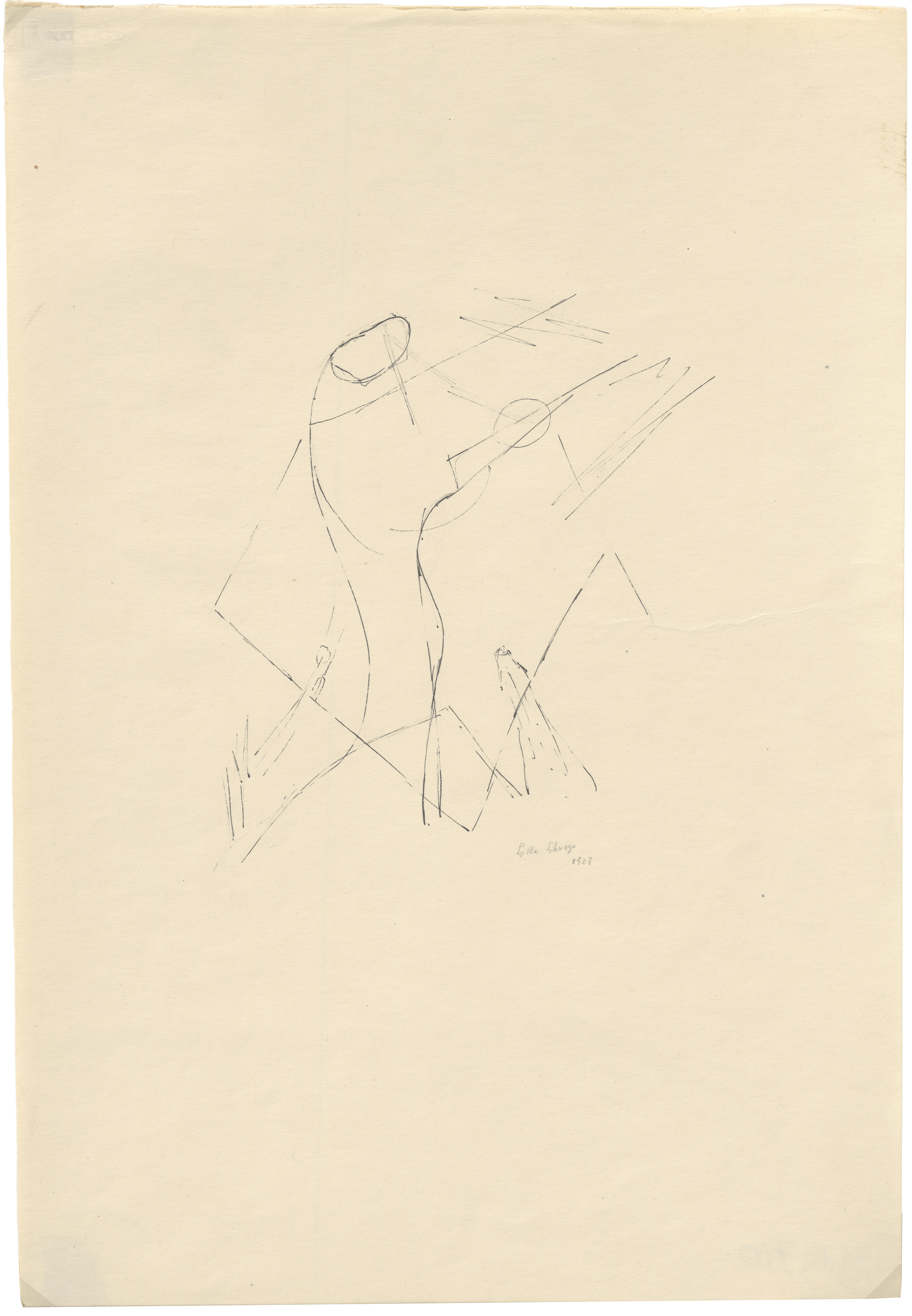 Nach seiner juristischen Promotion in Leipzig arbeitete Lothar Schreyer als Dramaturg am Deutschen Schauspielhaus Hamburg, seit 1919 leitete er zunächst die Kampfbühne in Hamburg, später war er an der Sturm-Bühne in Berlin tätig. Walter Gropius holte Schreyer 1921 für die Bühnenwerkstatt und die Maskenspiele ans Bauhaus. Bis 1926 arbeitete Schreyer an Herwarth Waldens Zeitschrift Der Sturm als Redakteur und Schriftleiter; zu dieser Zeit entstand die vorliegende dynamische, kristalline Federzeichnung. Beigegeben: Eine Farbstiftzeichnung auf Transparentpapier, möglicherweise von Lothar Schreyer.