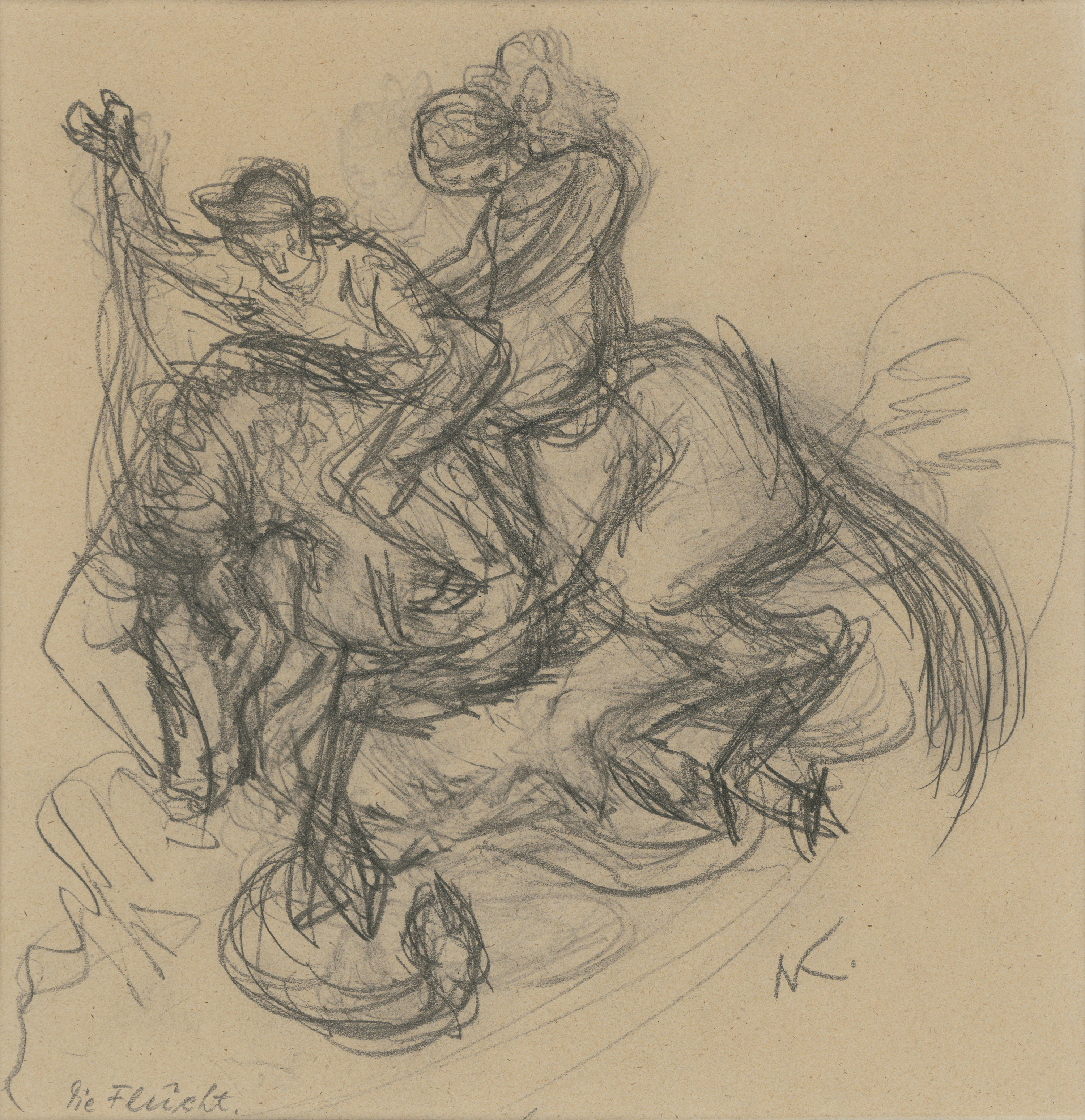 "Die Flucht" diente wohl als Vorzeichnung zur Lithographie gleichen Titels, 1928 (Hoberg 104). Jeweils verso eine weitere Bleistiftzeichnung des Künstlers. Die skizzenhaften Figuren fängt Kubin mit den charakteristischen lockeren, leicht nervösen Linien ein, und stets haftet ihnen auch etwas Phantastisches an.