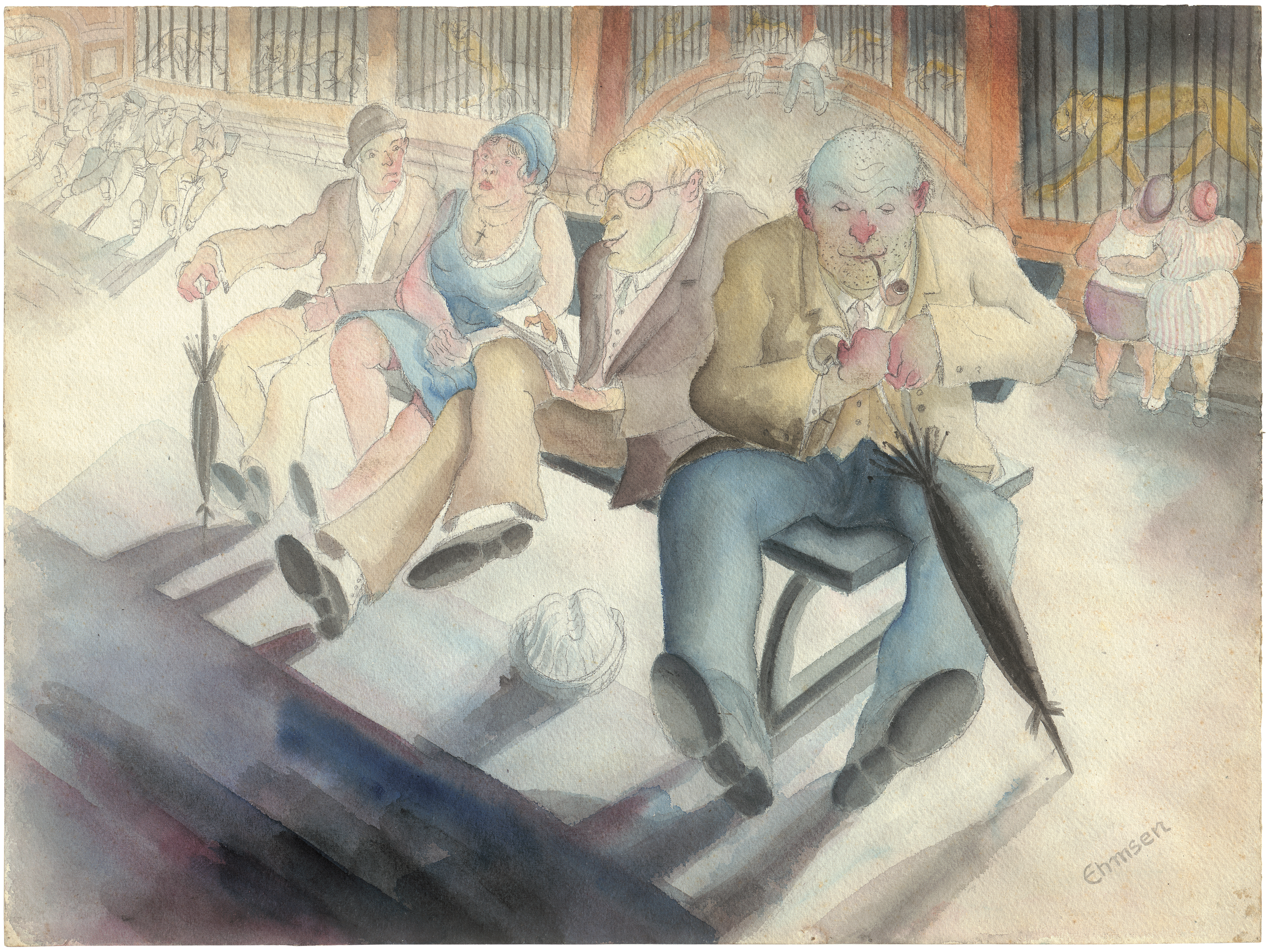 Schattenhaft drehen Raubkatzen ihre unendlichen Runden hinter den Gittern des Berliner Zoos, nur wenige Besucher stehen davor. All das bleibt aber im Hintergrund: Im Fokus stehen die vier Gestalten vorne, die Plätze auf einer Bank ergattert haben und eine Pause in der raubtiergeschwängerten Luft des Löwenhauses genießen. Sie entsprechen ganz Ehmsens charakteristischem Repertoire skurriler, prägnant und doch mit liebevollem Blick gezeichneter Figuren. Nach seinen Studien 1906-09 an der Kunstgewerbeschule in Düsseldorf, u.a. bei Peter Behrens, studierte er an der Académie Colarossi, Paris, und siedelte 1911 nach München, wo er Einflüsse durch den Blauen Reiter erhielt. Im Jahr 1929 ließ er sich in Berlin nieder, wo er bald die Kommunistische Partei bei den Reichstagswahlen unterstützte. Seine prägenden Erfahrungen in und nach dem Ersten Weltkrieg sowie Studien aus der Nervenheilanstalt dominierten sein Physiognomie- und Figurenrepertoire. Ehmsens aufrechte Haltung spiegelt sich auch in dem aufmerksamen Blick für die einfachen Menschen, der seinen Ausdruck in der vorliegenden Zeichnung findet.