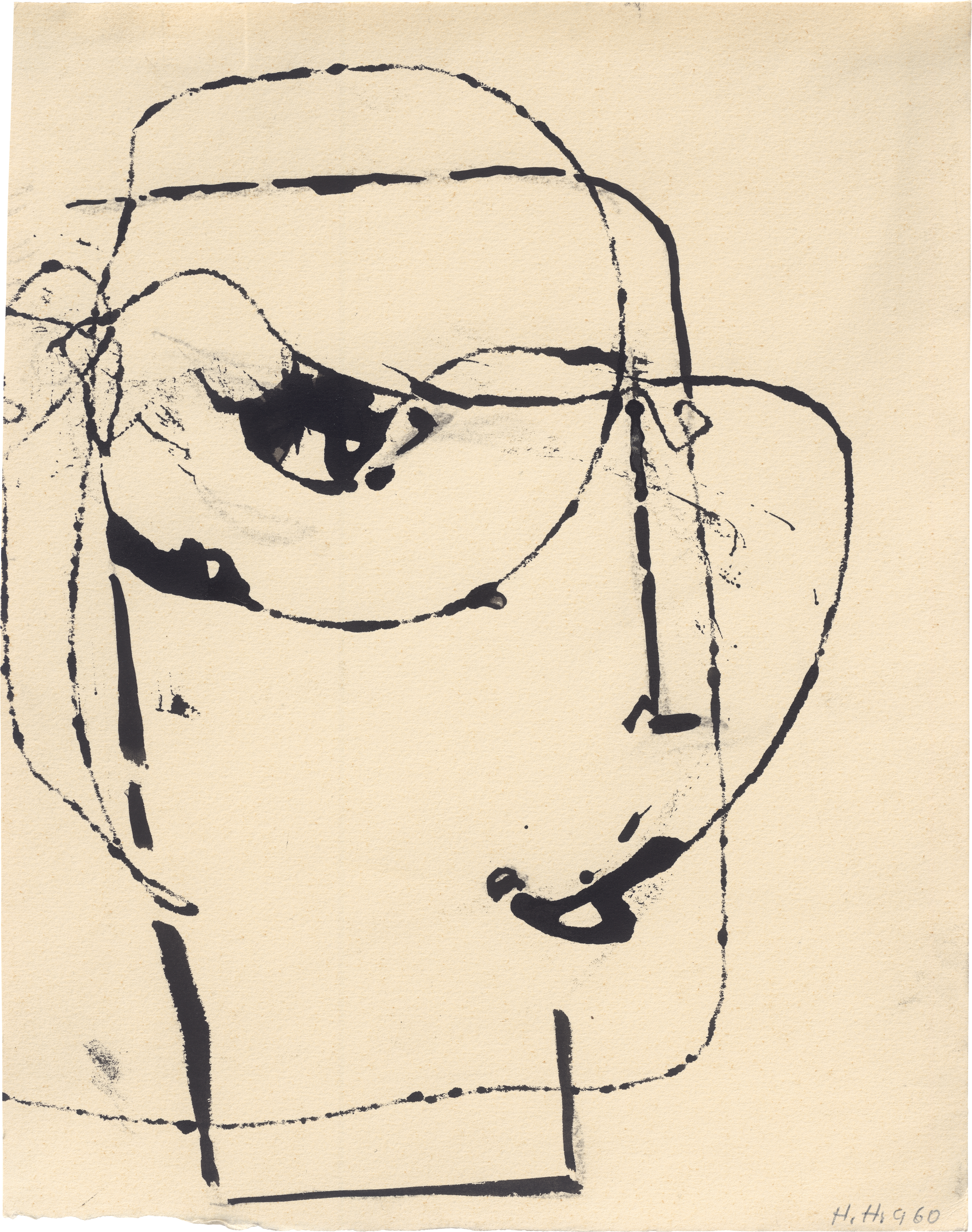 In schwungvollen Linien umreißt Höch das abstrakte Portrait und setzt dabei Kontraste in den schwarzen Partien von Mund und Auge. Eine schöne Studie aus dem Spätwerk der Künstlerin.
