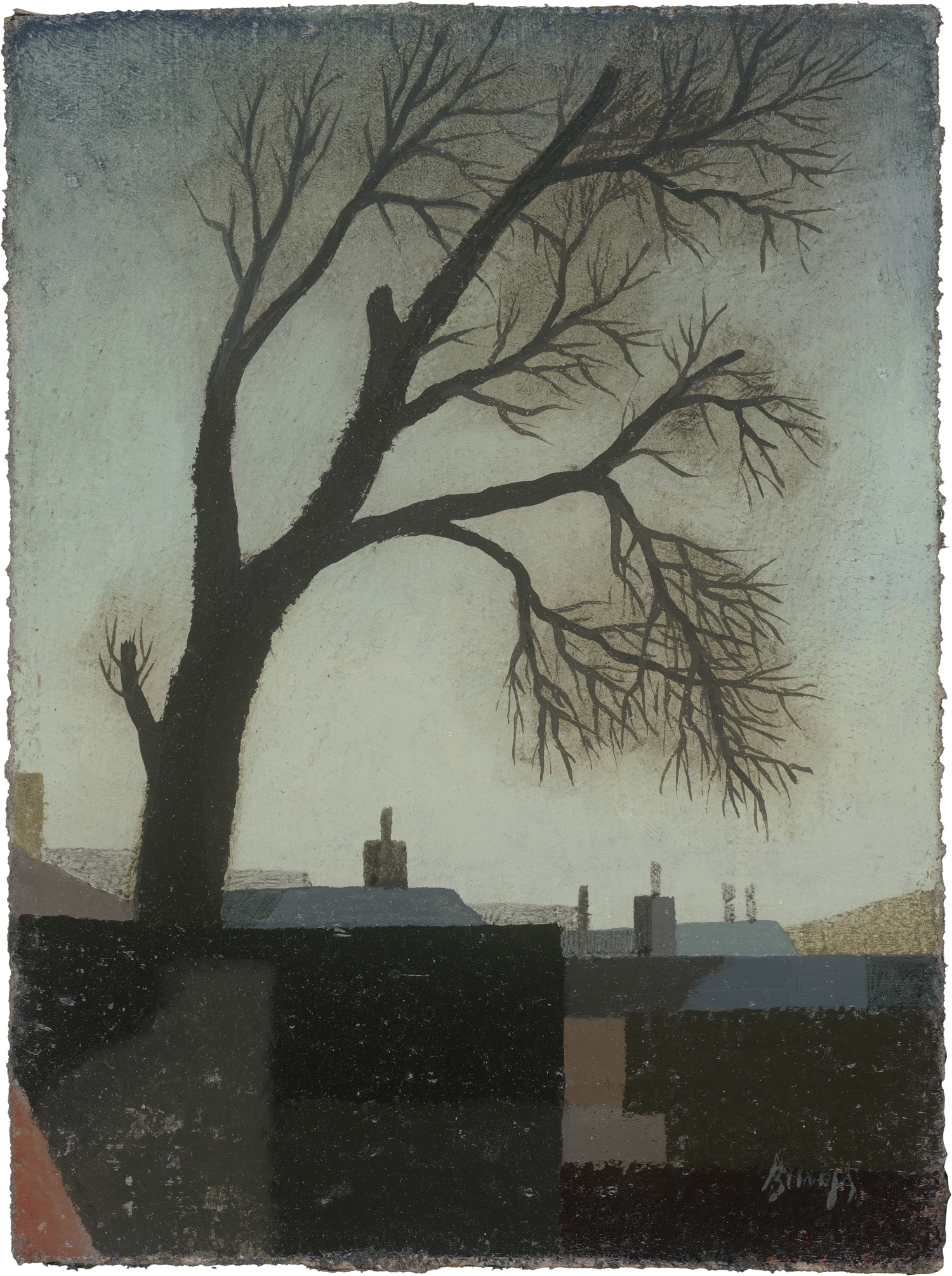 "Der Baum des Gartens" lautet Beneš' Titel übersetzt. Dunkel und winterlich kahl ragt das Geäst des Baumes von links ins Bild und überwölbt die menschenleere, geometrisch verschachtelte Industrielandschaft. Die zu eckigen Farbflächen stilisierten Gebäude schiebt Beneš zusammen, so dass sie bauklotzartig aneinander stehen. Unregelmäßig grob liegen die vom Künstler selber angerührten Farben auf der Bildoberfläche und verleihen ihr einen körnigen, unruhigen Charakter. Die Stille und Einsamkeit der akribisch gemalten Szenerien lassen die einprägsamen Gemälde des Künstlers so einzigartig in ihrer Ausstrahlung erscheinen. Nach der Schließung der tschechischen Universitäten durch die Nazis verdingte sich Beneš als Hilfsarbeiter auf den Prager Werften und konzentrierte sich zugleich ganz auf sein künstlerisches Schaffen. 1943 wurde er zur Zwangsarbeit in Deutschland einberufen. Nach seiner Rückkehr trat er dem Verein Štursa bei. Seine erste Einzelausstellung hatte er 1956 im Prager Theater D 34, ein Jahr später wurde er Mitglied der Gruppe Máj 57.