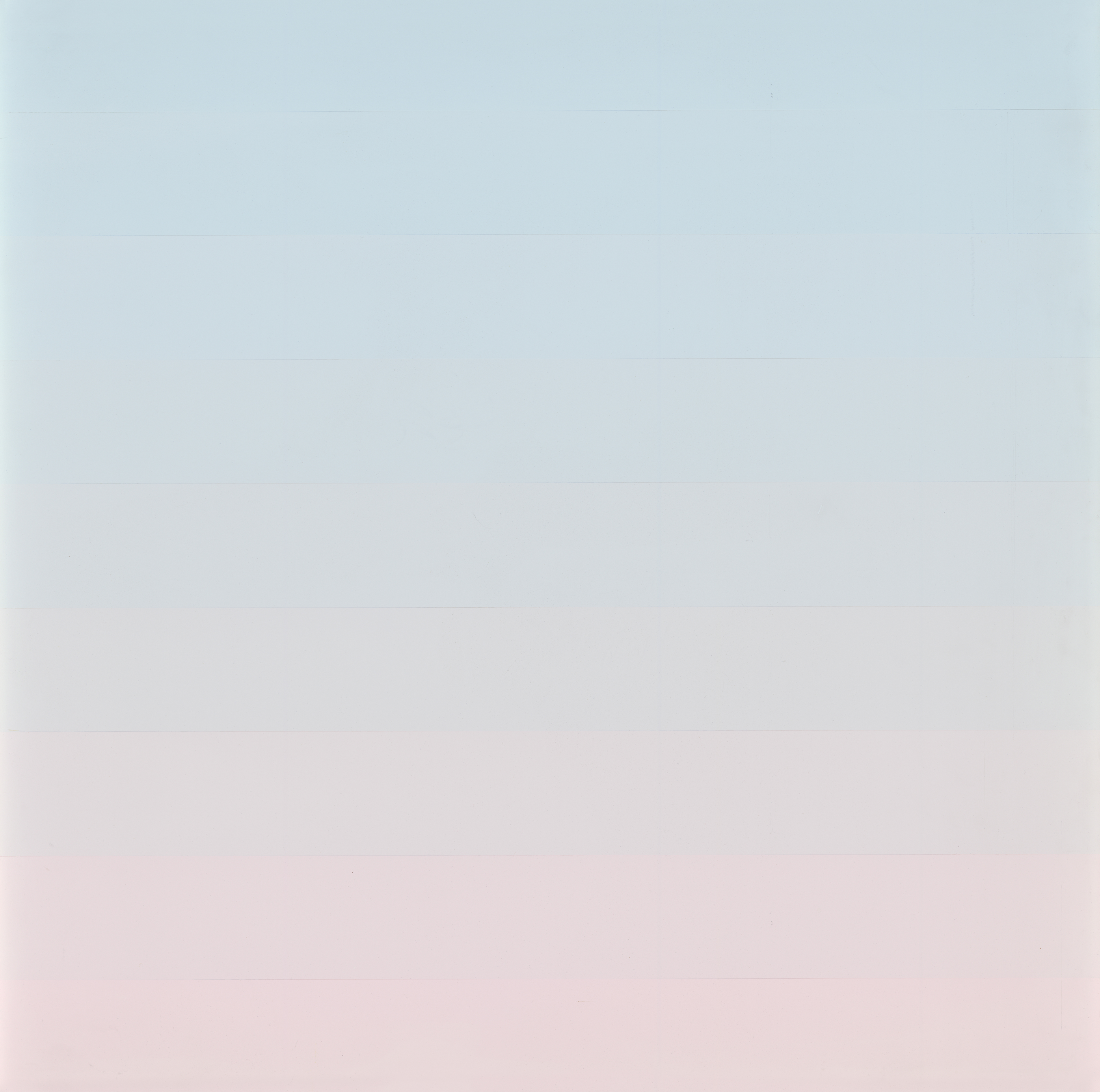 Zwischen Zartblau und Hellrosa changierende Streifenkomposition des Künstlers mit irisierender Wirkung. „Séquences chronomatiques“ (Farbstufenbilder) nennt Roeckenschuss, wichtiger Vertreter des frühen Minimalismus, seine um 1975 begonnene und bis um 2000 fortgesetzte Serie von streng vertikal angelegten Streifenbildern. Er malt oder collagiert dazu Reihungen vertikaler farbiger Streifen, mal schmal und lang, mal breit und kurz, immer jedoch stehen die Streifen in einem raffinierten mathematisch-musikalischen System zueinander. Seine Arbeiten sind in internationalen Sammlungen wie beispielsweise dem Museum of Modern Art in New York, der Sammlung der Deutschen Bank sowie der Daimler Chrysler Collection vertreten. Im Künstlerrahmen.