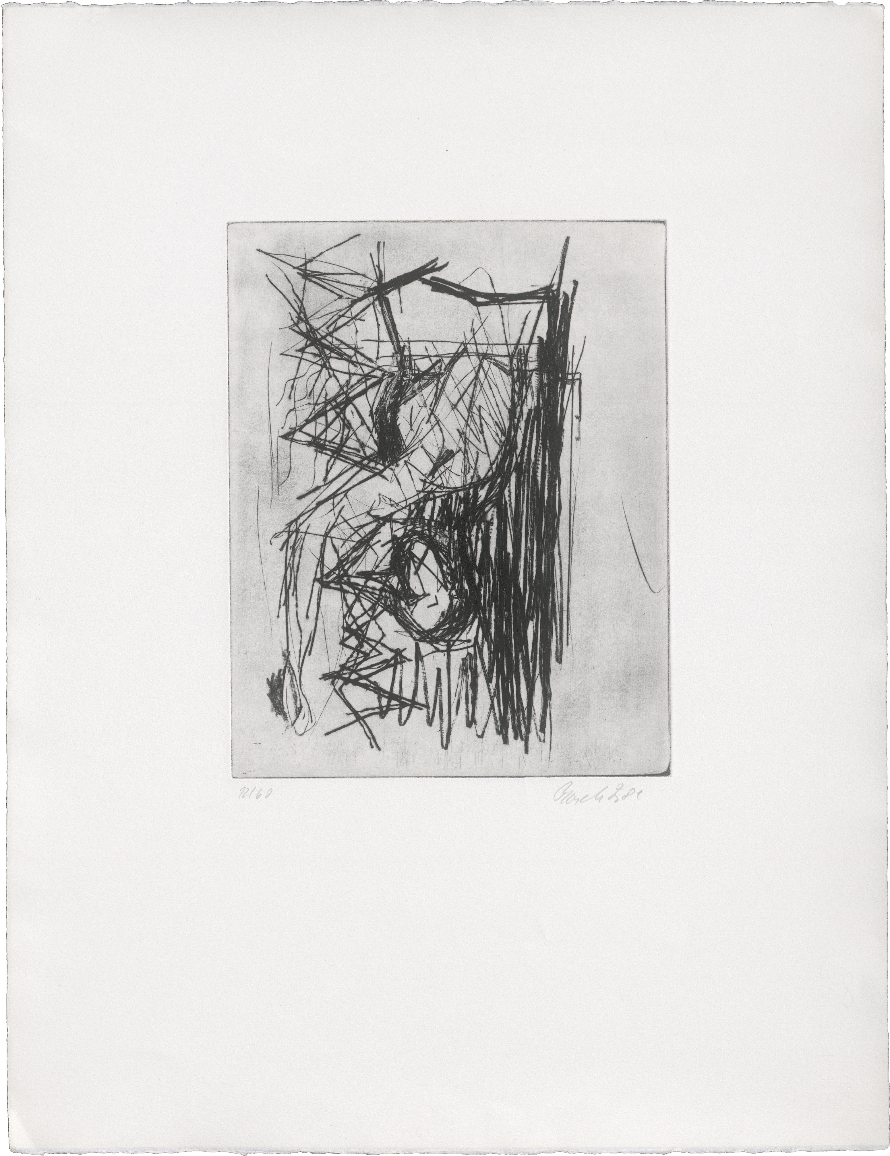 Exemplar des zweiten, endgültigen Zustandes, erschienen in einer Gesamtauflage von ca. 78 Exemplaren als Jahresgabe des Kunstvereins Braunschweig 1981. Prachtvoller, tiefdunkler Druck mit fein changierendem Plattenton, partiell kräftig eingefärbter Facette und mit dem vollen Rand, oben und unten mit dem Schöpfrand.