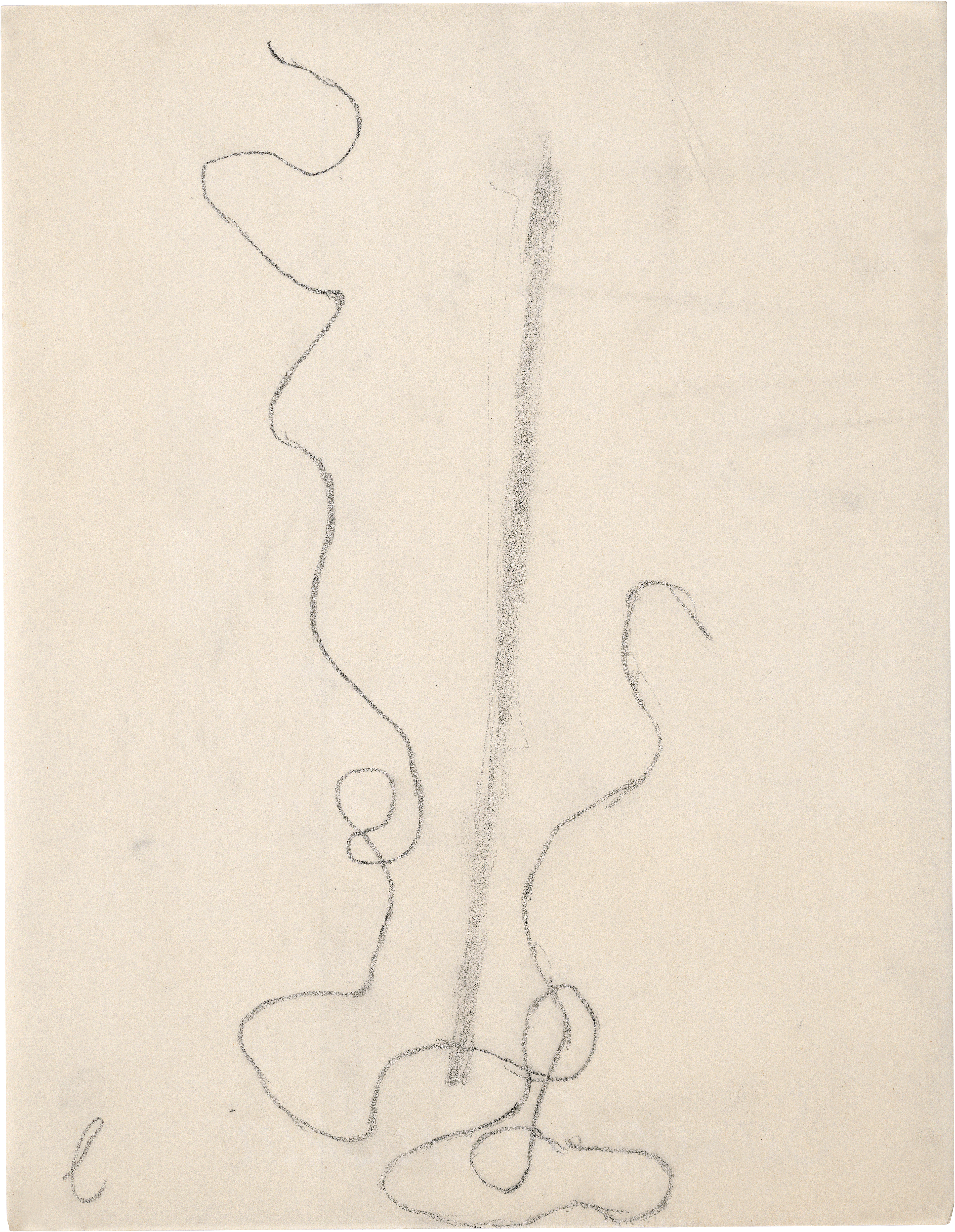 Eine Linie schwingt sich durch die Bildfläche, mäandert und setzt sich in Beziehung zu der mittig stehenden, schattenhaft erscheinenden Geraden. In der mit einfachsten Mitteln geschaffenen Zeichnung verdeutlicht die Harmonie der Gegensätze einen der Grundzüge von Bauers gegenstandsfreien Kompositionen.