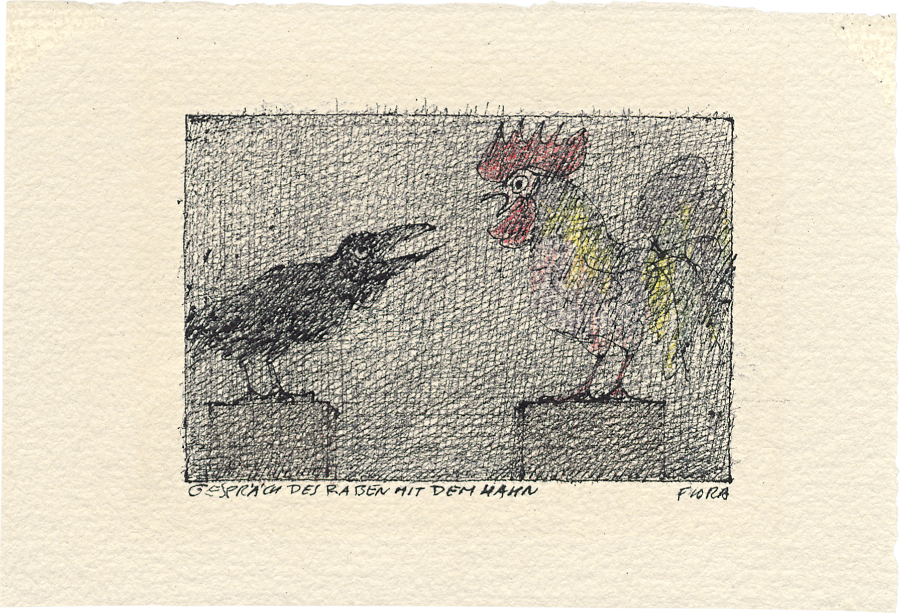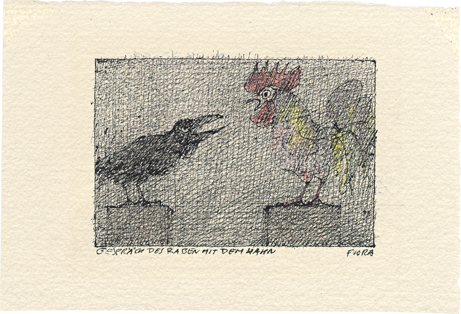 (1922 Glurns/Südtirol - 2009 Innsbruck)Gespräch des Raben mit dem Hahn