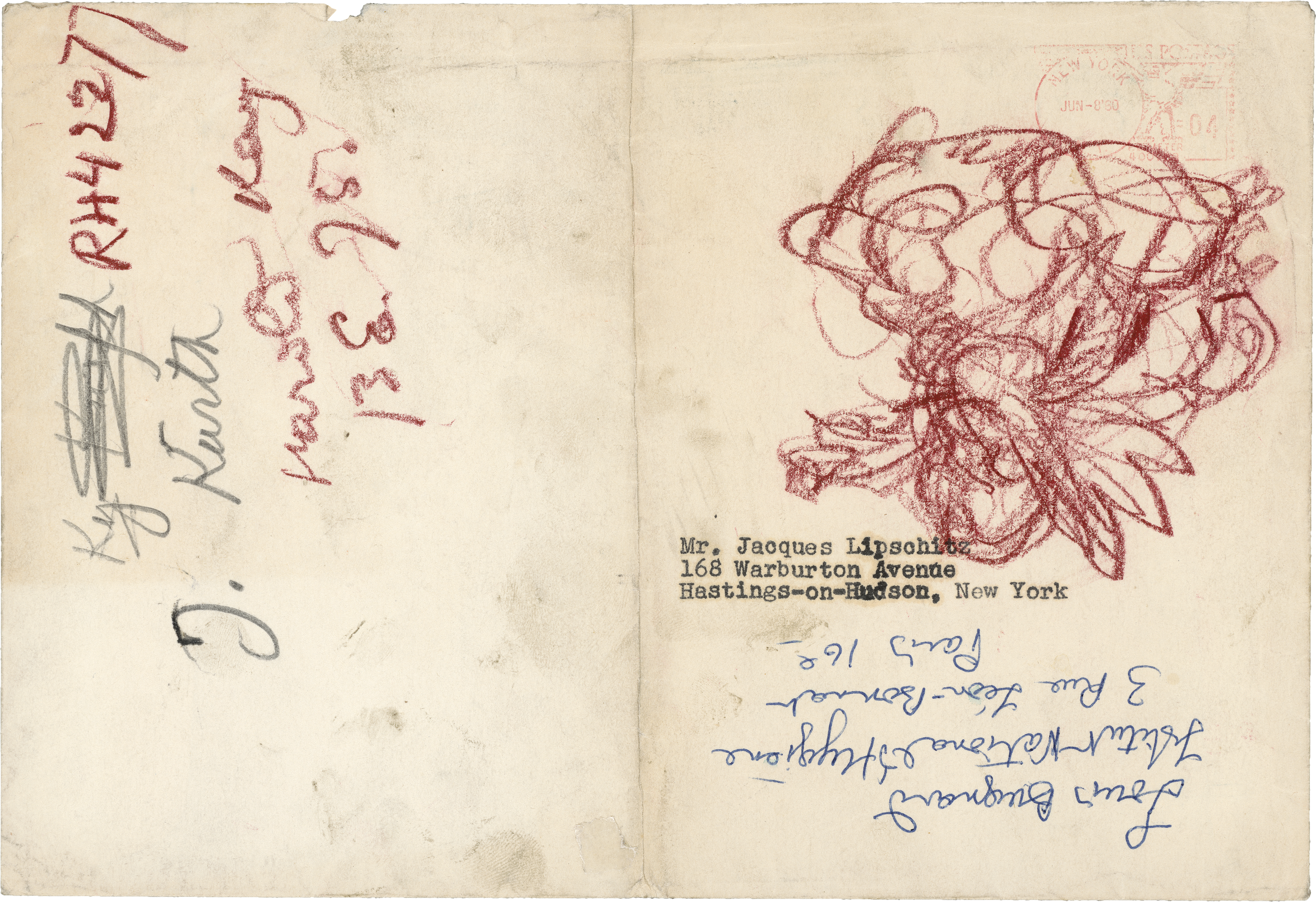 Auf einen Briefumschlag der Graham Gallery, New York, adressiert im Jahr 1960 an Lipchitz' Adresse in Hastings-on-Hudson, New York, zeichnet der Künstler neben Namens- und Adressnotizen seine weich geschwungenen Formen als Ausdruck spontaner Gestaltungsgedanken. Verso weitere Kompositionsskizze.