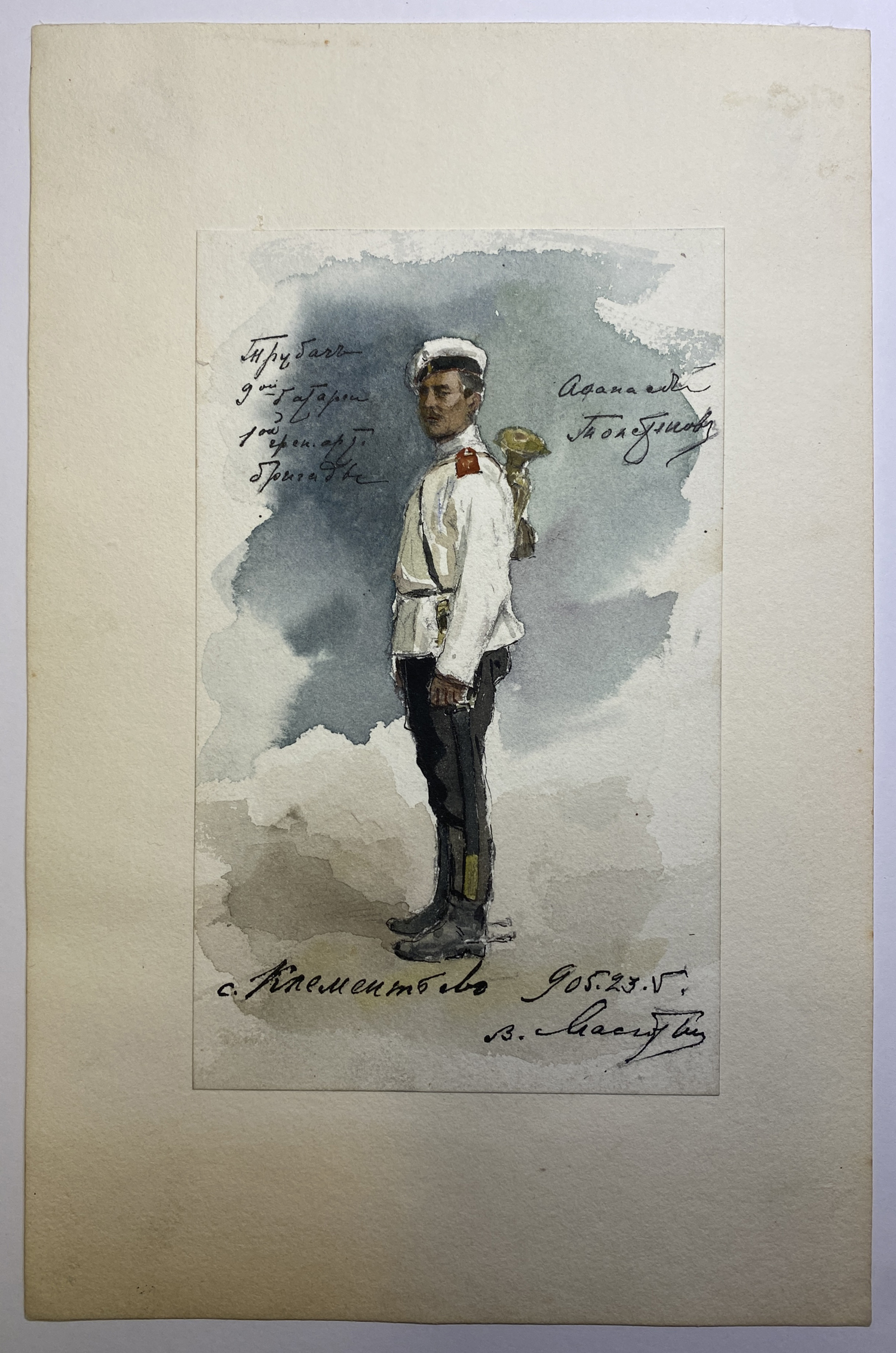 Masjutins Herkunft und Ausbildung spiegeln sich im teils soldatischen Charakter der kleinen Aquarelle: Als Sohn eines Generals in Kiew und Moskau aufgewachsen, schlug er anfangs eine militärische Laufbahn ein. Diese gab er 1907 auf, um an der Moskauer Hochschule für Malerei, Bildhauerei und Architektur an der Seite von Wladimir Majakowski und Dawid Burljuk zu studieren.