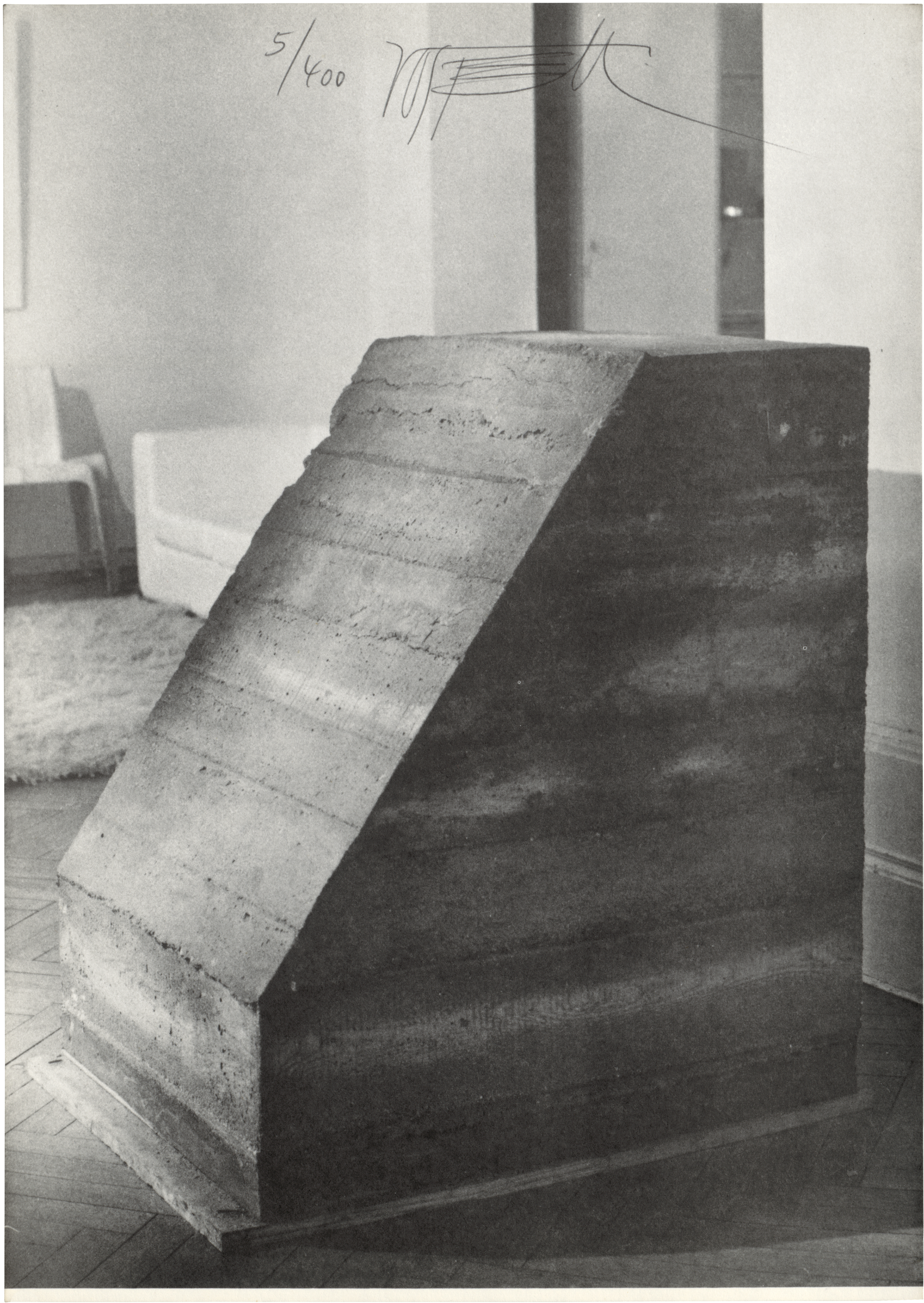 Das komplette Mappenwerk. Weitere 100 Exemplare wurden vom Künstler als Betonbuch gegossen, zudem existiert eine Sonderauflage mit beimontiertem Sägeblatt. Herausgegeben von der Edition Howeg, Hinwil 1971.