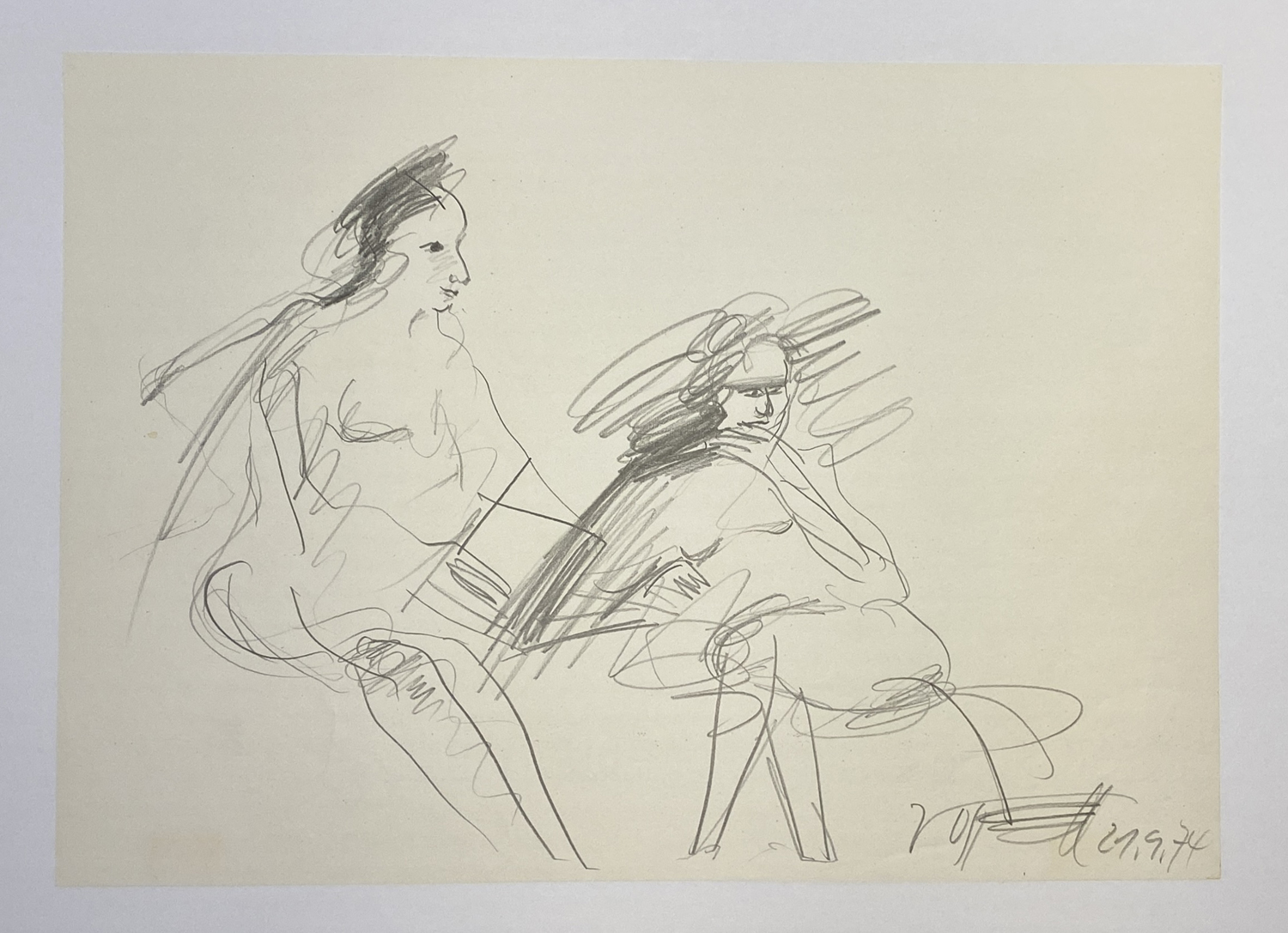 Mit lockerem, schwungvollem Strich ausgeführte Aktstudien jeweils zweier Frauen, sowie eine offenbar spontan im Pariser Restaurant entstandene kubisch-organische Komposition. Aus dem Wechsel zarter Bleistiftlinien, tiefschwarzer Schraffuren und grau nuancierter Schattierungen entstehen reizvoll gestaltete Studien. Vostell, einer der Pioniere des Environment, der Videokunst, des Happening sowie der Fluxus-Bewegung, beschäftigte sich immer wieder mit abstrahierten Figuren, die deutlich den Blick des Bildhauers erkennen lassen.