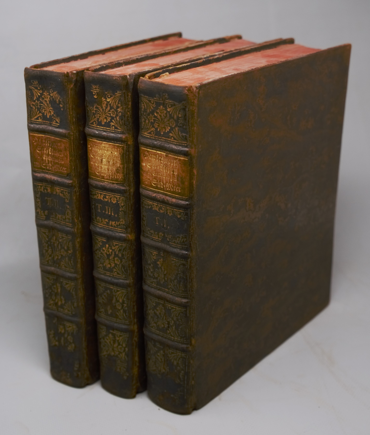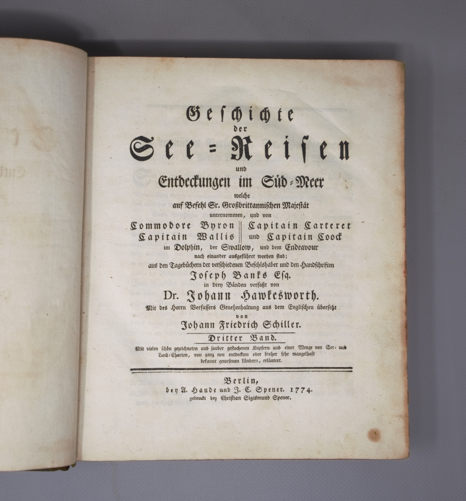 Hawkesworth, John. Geschichte der See-Reisen und Entdeckungen im Süd-Meer. Aus dem Englischen übersetzt von Johann Friedrich Schiller. 3 Bände. Mit 64 zumeist gefalteten oder doppelblattgroßen Kupfertafeln und -karten. 25 x 20,5 cm. Marmorierte Lederbände d. Z. (berieben, Rücken nachgedunkelt) mit floraler RVergoldung (diese mit Fehlstellen) und goldgeprägtem RSchild. Berlin, Haude und Spener, 1774.