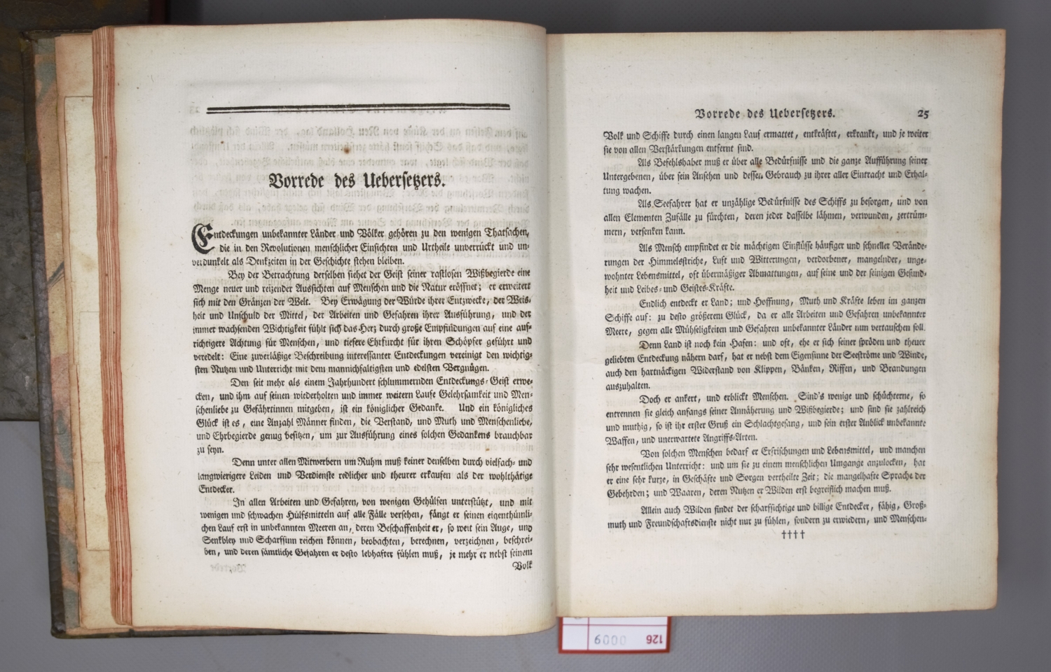 Sabin 30942. Cox I, 19f. Hocken S. 19. Engelmann I, 98. Goedeke IV/1, 620 f., 102, 1. Griep-Luber 494. – Erste deutsche Ausgabe der Beschreibung verschiedener Expeditionsreisen in die Südsee. Enthält Beschreibungen der Reisen von Carteret, Byron, Wallis (Band I) sowie Cooks erster Weltreise auf der Endeavour 1768 bis 1771 (Bände II und III) in der Zusammenfassung durch den Journalisten John Hawkesworth, die auf den Tagebüchern und Berichten von Joseph Banks basiert. Die Kupfer zeigen neben Karten, Plänen und Ansichten die Eingeborenen mit ihren Haartrachten und Bekleidungen, Lebensgewohnheiten, Behausungen und Gerätschaften, Schiffen u. v. a. – Etwas fleckig, wenige Falttafeln mit unbedeutenden, teils hinterlegten kleinen Randeinrissen, eine Tafel stärker gebräunt. Insgesamt wohlerhalten.