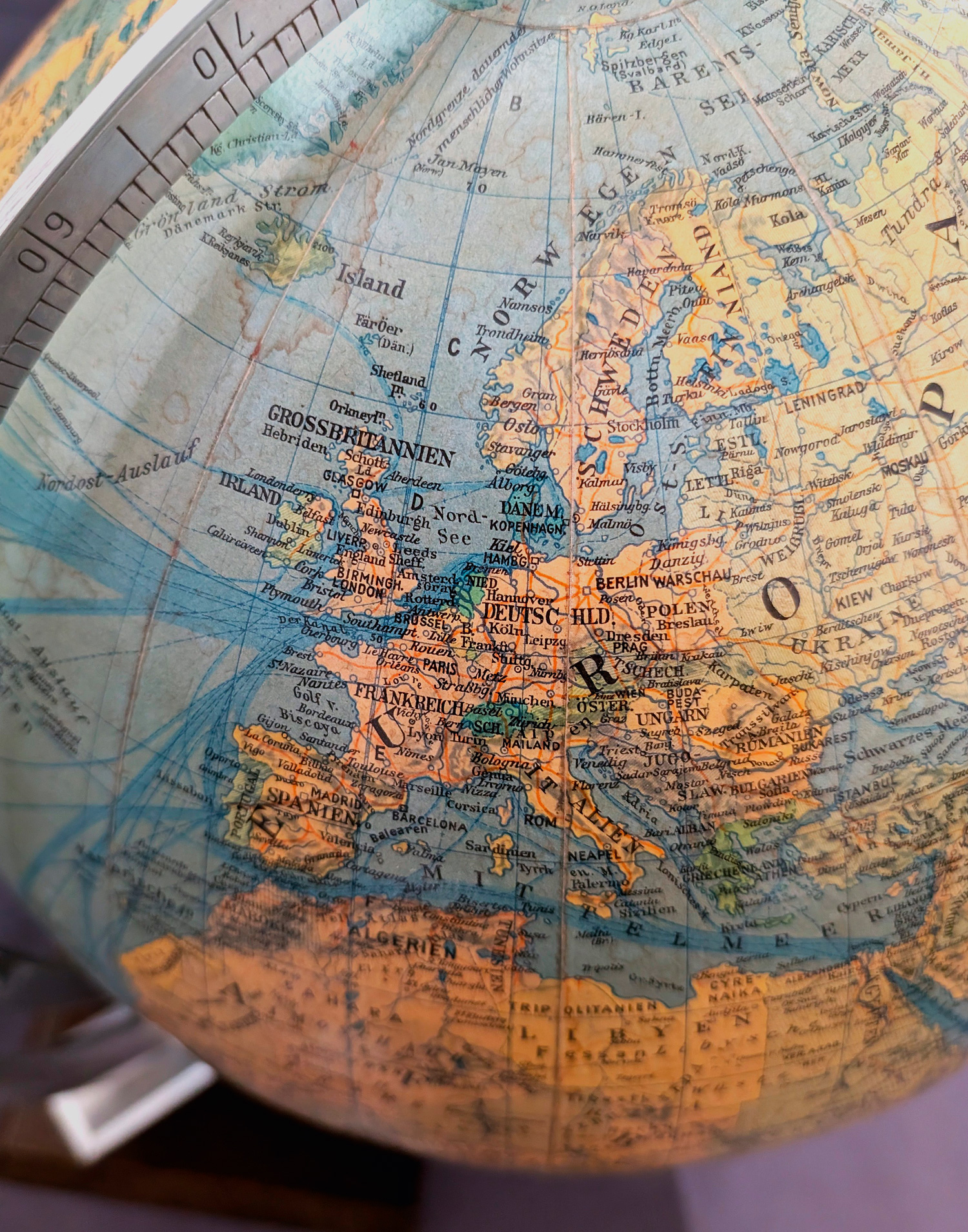 Mit Halbmeridian-Skala und Gestell aus Aluminium auf Holzplatten-Sockel. Höhe: 50 cm. Durchmesser: 55 cm. Berlin und Stuttgart, Columbus Verlag Paul Oestergaard K.G., 1950er Jahre.