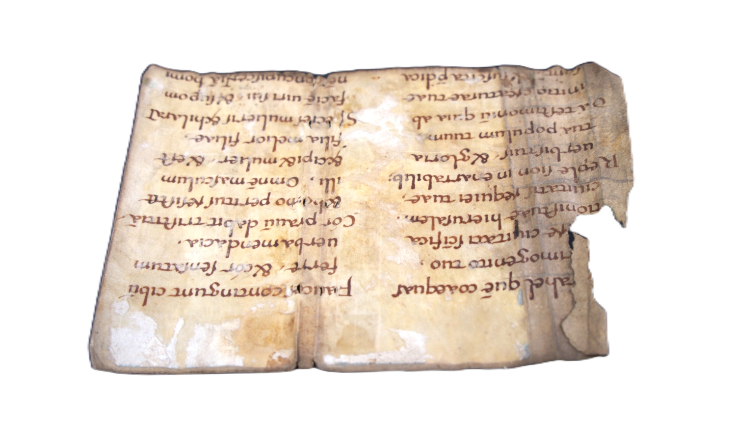 Jesus Sirach. Fragment einer karolingischen Bibelhandschrift mit vier Textstellen aus dem Buch Jesus Sirach (Sir 35,23-26, 36,4-9, 36,14-17 und 36,21-24). Lateinische Handschrift auf Pergament. Qualitätvolle, regelmäßige und ausgewogene Karolingische Minuskel. Vier obere Kolumnenreste auf 1 Bl. (recto und verso) mit viermal 11 Zeilen. Schriftraum ursprünglich ca. 24-25 x 20-21 cm mit ca. 25-26 Zeilen. Blattgröße ursprünglich ca. 33-35 x 23-25 cm. Vermutlich Nordfrankreich, 1. Hälfte 9. Jahrhundert.