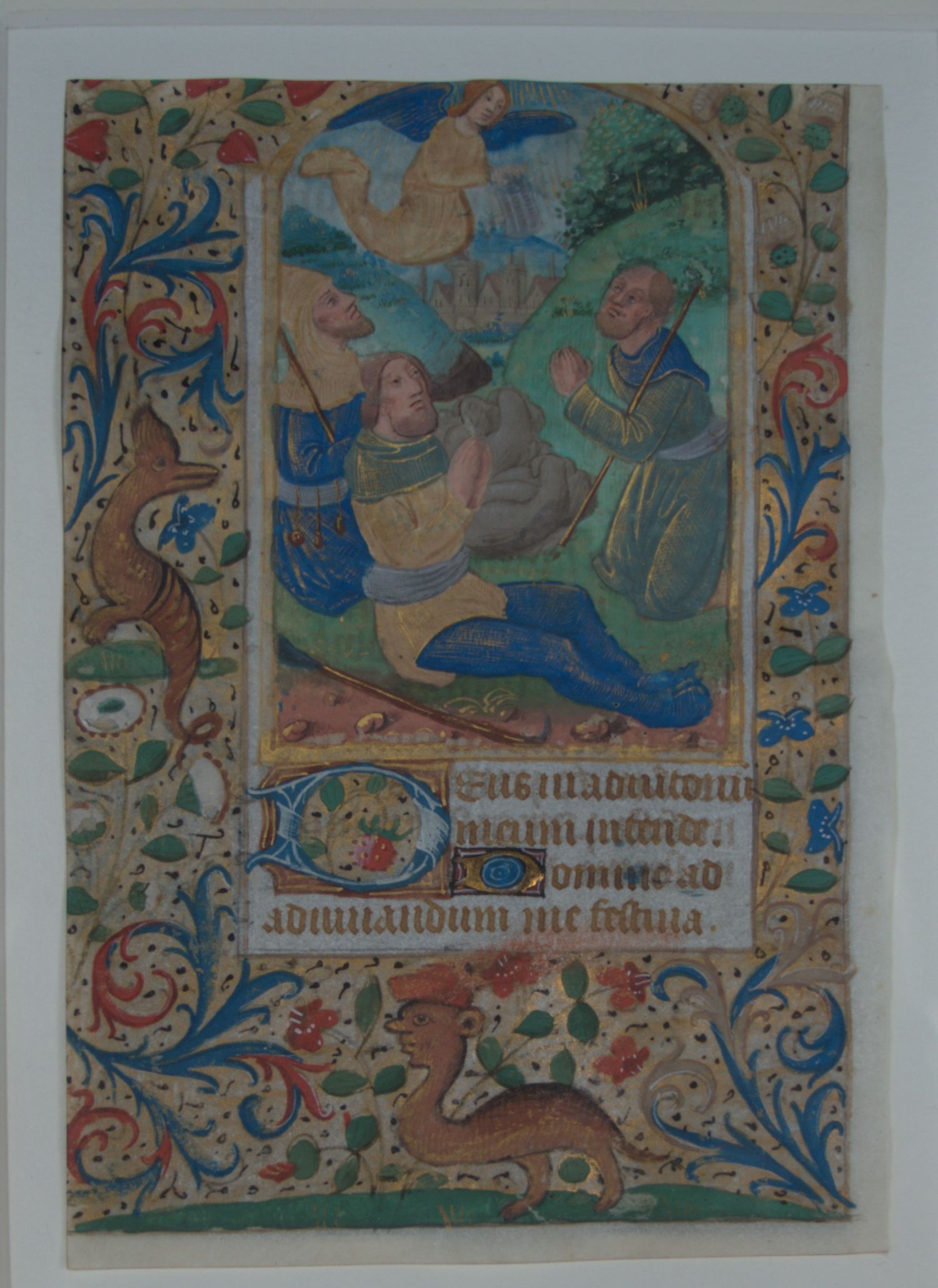 Zwei christologisch bedeutende Szenen aus dem Leben des Heilands Jesus Christus. Verkündigung an die Hirten: Drei Hirten in blauen und grünen Wämsern lagern anbetend auf einem grünen Hügel, als ihnen der Engel über der Stadtsilhouette von Bethlehem erscheint. In der breiten Bordüre sind zwei braune Fantasietiere mit lustigem Schopf bzw. Hut, umgeben von rotem und blauen Akanthus auf Pinselgold dargestellt. Die zweite Miniatur zeigt die Kreuzigung Christi, zur Rechten des Heilands Marie mit Johannes, rechts der Hauptmann Longinus mit dem Speer, begleitet von Soldaten. – Teilweise etwas knapp über die Rahmenlinie beschnitten (kaum Bordüreverlust), nur unwesentlicher Oberflächenabrieb, insgesamt sehr dekorativ und hübsch gerahmt.