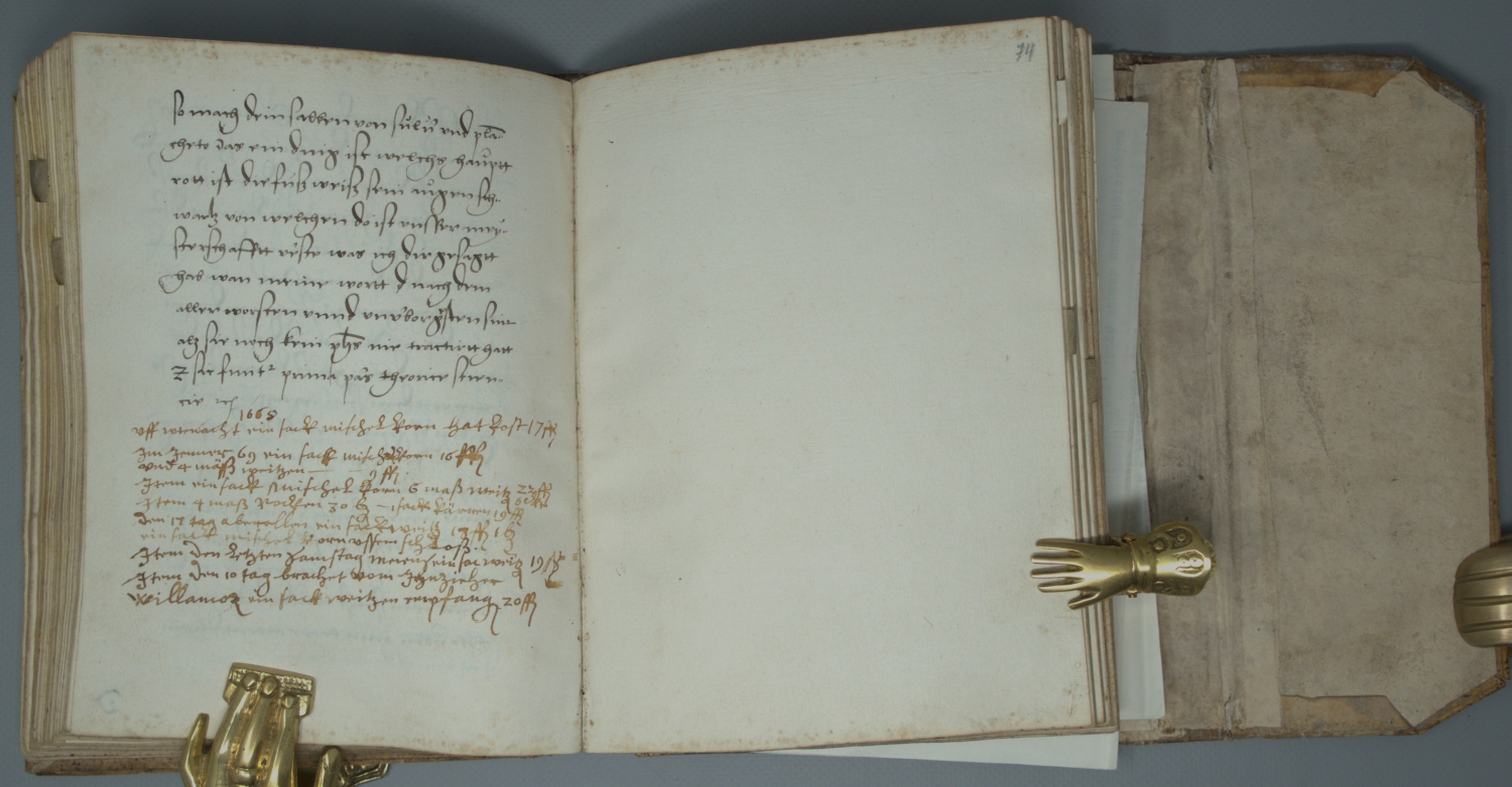 Auf leergebliebenen Blättern (1r-1v, 23v, 43r-46r, 73v. 106v-109v, 113v-114v) wurden im Zeitraum 1650-1694 persönliche und geschäftliche Aufzeichnungen von Mitgliedern der in der Ostschweiz (u.a. Lausanne) ansässigen Familien Krachbeltz, Criblet und Sechaux eingetragen. – Nur ganz vereinzelt etwas fleckig, wenige Randverstärkungen, Vorsätze stärker angestaubt und gedunkelt, wenige Seiten leicht angeschmutzt zum Schluss. Die unbeschriebenen Blätter meist blütenweiß. Der bemerkenswert schöne Klappenband mit reicher Blindprägung im Schweinsleder ist teils leicht abgegriffen und etwas angeschmutzt, zeigt neben Floralvignetten Blindstempel mit Eicheln und jeweils eine elegante Rolle mit den sieben Kardinaltugenden.