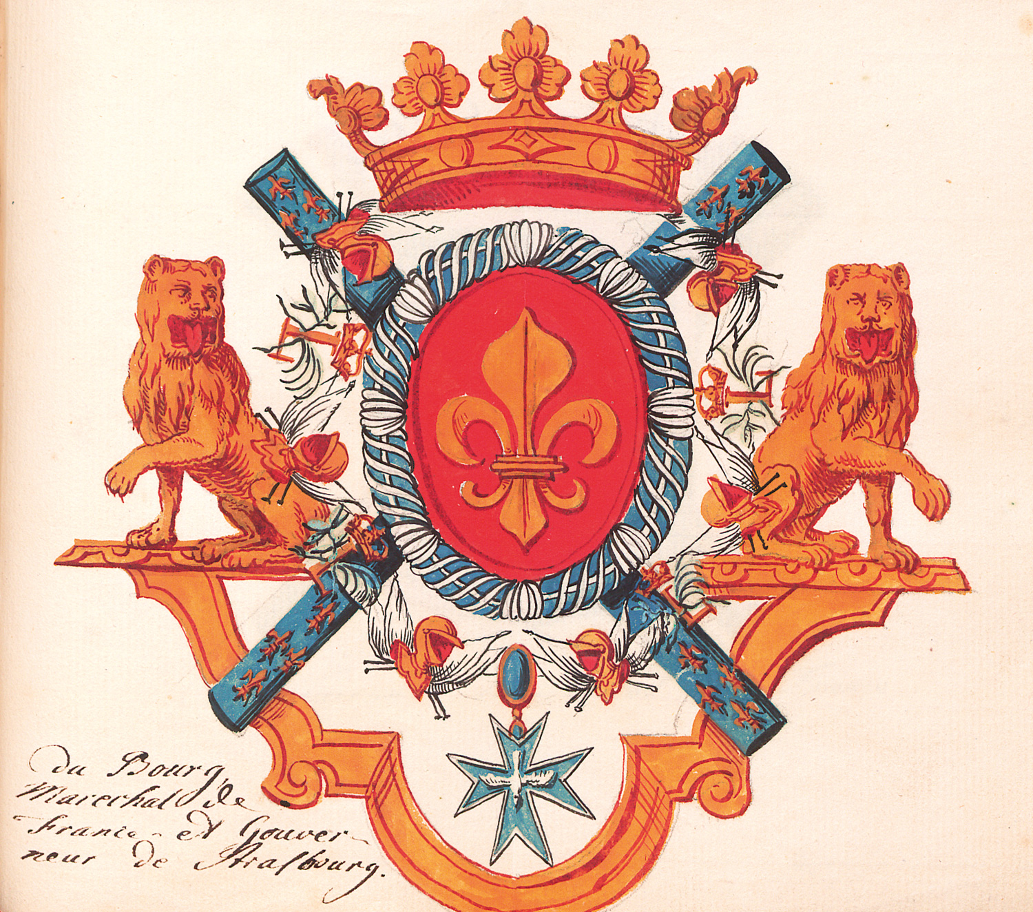 Am Anfang ein großes kaiserliches Wappen mit Krone, Einhorn, Greif und dem Orden vom Goldenen Vlies mit hs. Beischrift "Duc d'Espagne en Russie - Liria grand et Ambassadeur 1728". Enthalten sind auch englische und schottische Adelsgeschlechter "Angleterre", "Ecosse", "France" z. B. "Du Bourg Maréchal de France et Gouverneur de Straßbourg", "Hollande", "Gueldre" etc. – Nur vereinzelte kleine Oberflächenbereibungen, wenige Farbabplatzungen, fast durchgehend in bemerkenswert guter, frischer Qualität.