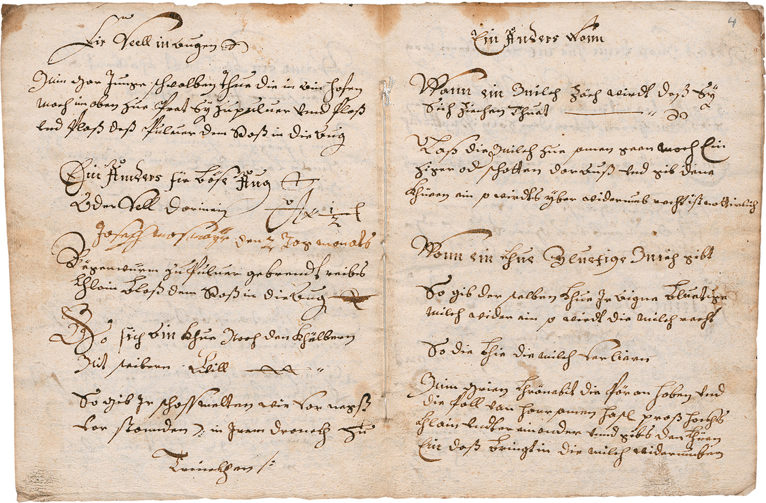 Rezepte zur Kurierung von Pferden ("Wenn ein Roß aufgebrochen ist mit Zeiten..."), denen "Ain segenes Geistliches Liedt" beigegeben ist. An dessen Schluss datiert "1728". – Erstes Blatt hier zu einem Drittel abgerissen (Textverslust), wahrscheinlich fehlen anfangs weitere Blätter, etwas fleckig, mit Gebrauchsspuren. Provenienz: Tenner Heidelberg Auktion 81 10/1970. Sammlung Prof. Dr. Gerhard Eis, Heidelberg, Hs. 157.