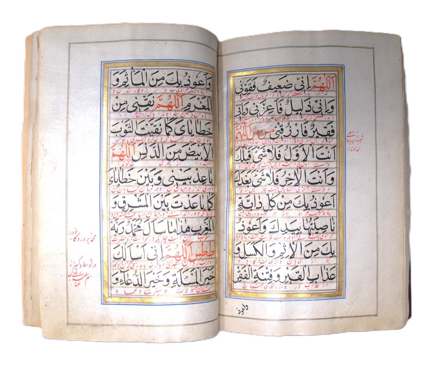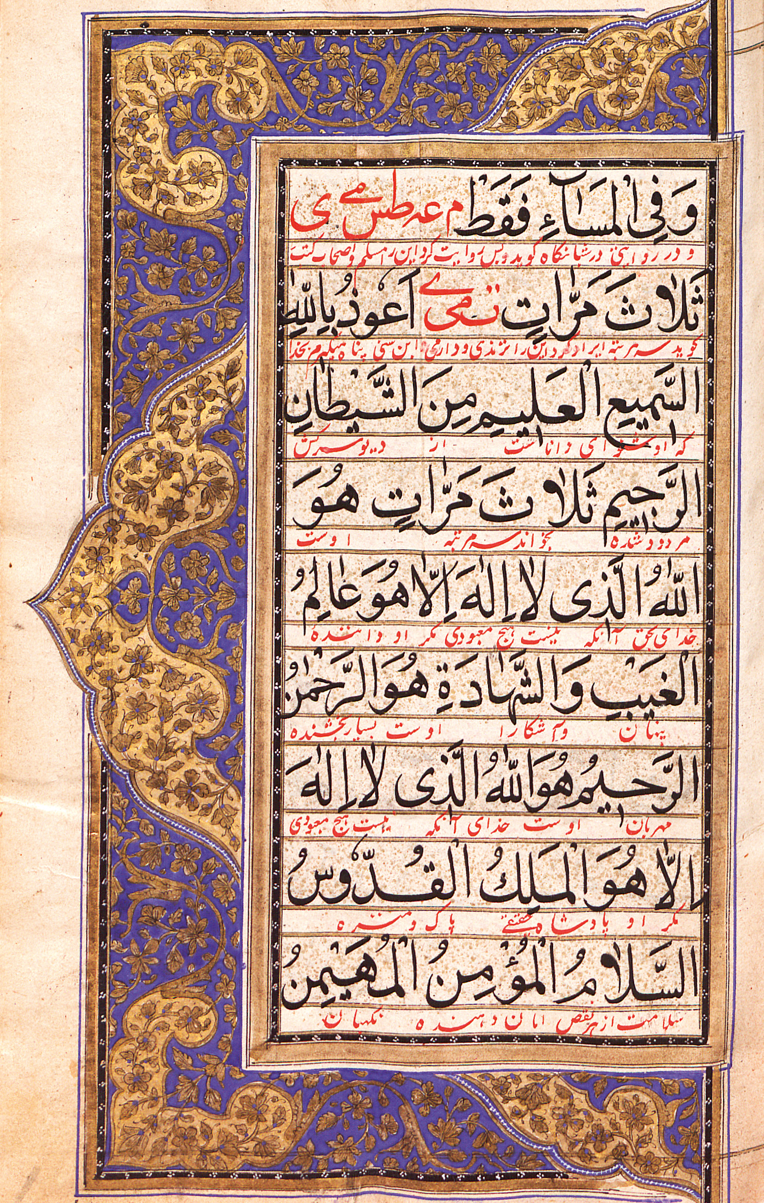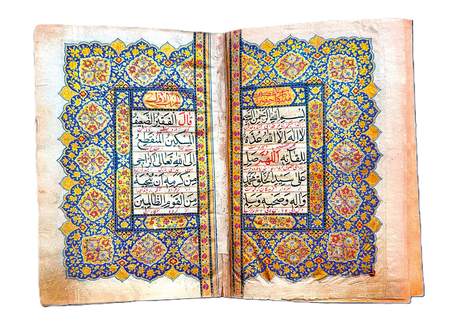 Während der mystisch-heiligen Urtexte in hoher aufrecht gezogener, minimal nach links kippender schwarzen Kalligraphie im Naskhi-Duktus und mit Auszeichnungen in Rot, etwa für den Gottesnamen "Allah", "Der Mächtigste", "Der Allerbarmer" etc., geschrieben wurde, sind in den schmaleren Zeilen dazwischen - jeweils unter dem arabischen Urtext - Übersetzungen in Farsi im Nastaliq-Duktus. Die Textanlage mit den interlinearen Übersetzungen ist typisch für die Koranschulen und Schreiberwerkstätten in Isfahan oder Shiraz, teils auch in Teheran, in der Übergangszeit vom späten Safawiden- zum Qajar-Reich (18. und 19. Jahrhundert). Die Künstler der Kitabkhana (Werkstätten bzw. Schreiberateliers) zeichneten sich nicht nur durch eine Rückbesinnung auf klassische Stile, sondern auch durch neue, phantasievolle Ornamente aus, die ganz besonders minutiös und nuanciert ausgearbeitet waren, so daß Koran- und Gebetshandschriften entstanden, die für die reiche Mittel- und Oberschicht, den Hof und wohlhabende Händler gedacht waren. – Nur leichte Handhabungsspuren, der erste Ziertitel mit kleinen Knitterspuren und sauberer Randansetzung, sonst kaum Randläsuren, gelegentlich etwas stock- und braunfleckig. Vorsätze mit arabischen Annotationen von alter Hand. Vereinzelt auch im Textblock Randkommentare in Rot. Mit wenigen hinterlegten Randläsuren und kleinen Randausbrüchen. Insgesamt altersgemäß in herausragend gutem Zustand.