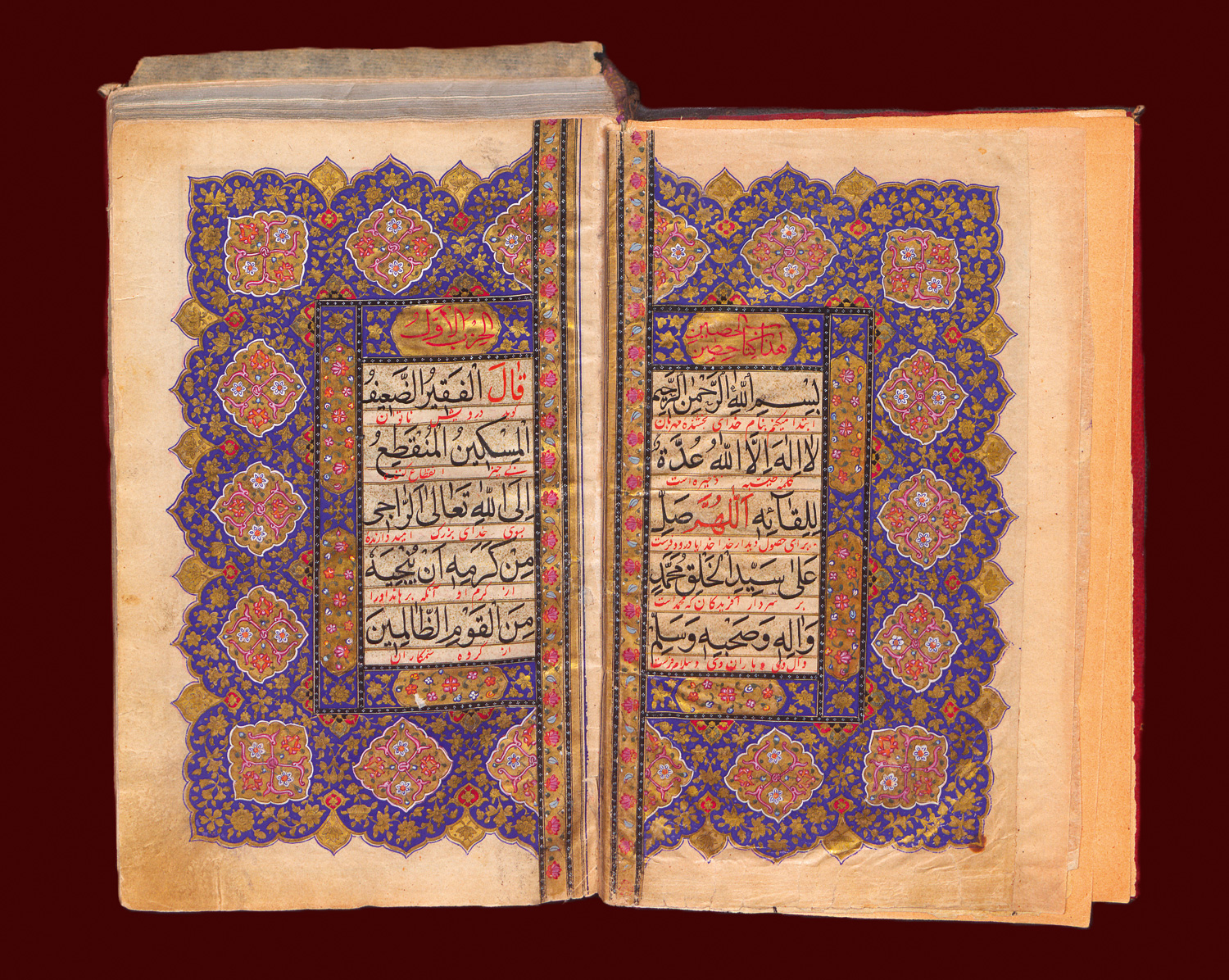 Ibn al-Dschazari (auch: Ibn al-Jazari bzw. Ibn-al-Gazari, Muhammad Ibn-Muhammad). Kitab al-hisn al-hasin min kalam saiyid al-mursalin (arabice: Abhandlung über Zeiten und Gelegenheiten zum Gebet für den Propheten Muhammad, zusammengestellt nach Traditionswerken). Persische Handschrift mit prachtvoller Illumination auf gelatiniertem Büttenpapier. 298 nn. Bl. 9 Zeilen mit den Versen in schwarzer Naskhi-Schrift und interlinearer Farsi-Übersetzung in Nastaliq-Duktus. Jede Seite mit breitem Goldrahmen in vielfachem schwarzen und blauem Lineament, Zeilentrennern in goldgefülltem Doppellineament, Auszeichnungen in roter Tinte und 7 besonders reich vergoldeten Doppelzierseiten Sar-lauh im Stil der typischen Carpet Pages in Lapislazuli-Blau mit breiter Rahmenornamentik in Blattgold, Lapisblau und teils mit Goldblumen und floralen Elementen in Hellblau, Rot, Orange und Grün. Schriftraum: 13,2 x 6,5 cm. Format: 19 x 12,5 cm. Schlichter schwarzbrauner Lederband des 19. Jahrhunderts (stärker berieben und beschabt, teils überarbeitet bzw. alt restauriert) mit goldgeprägten Deckelfileten (diese ebenfalls berieben). Persien (Shiraz, Isfahan?) 18. Jahrhundert.