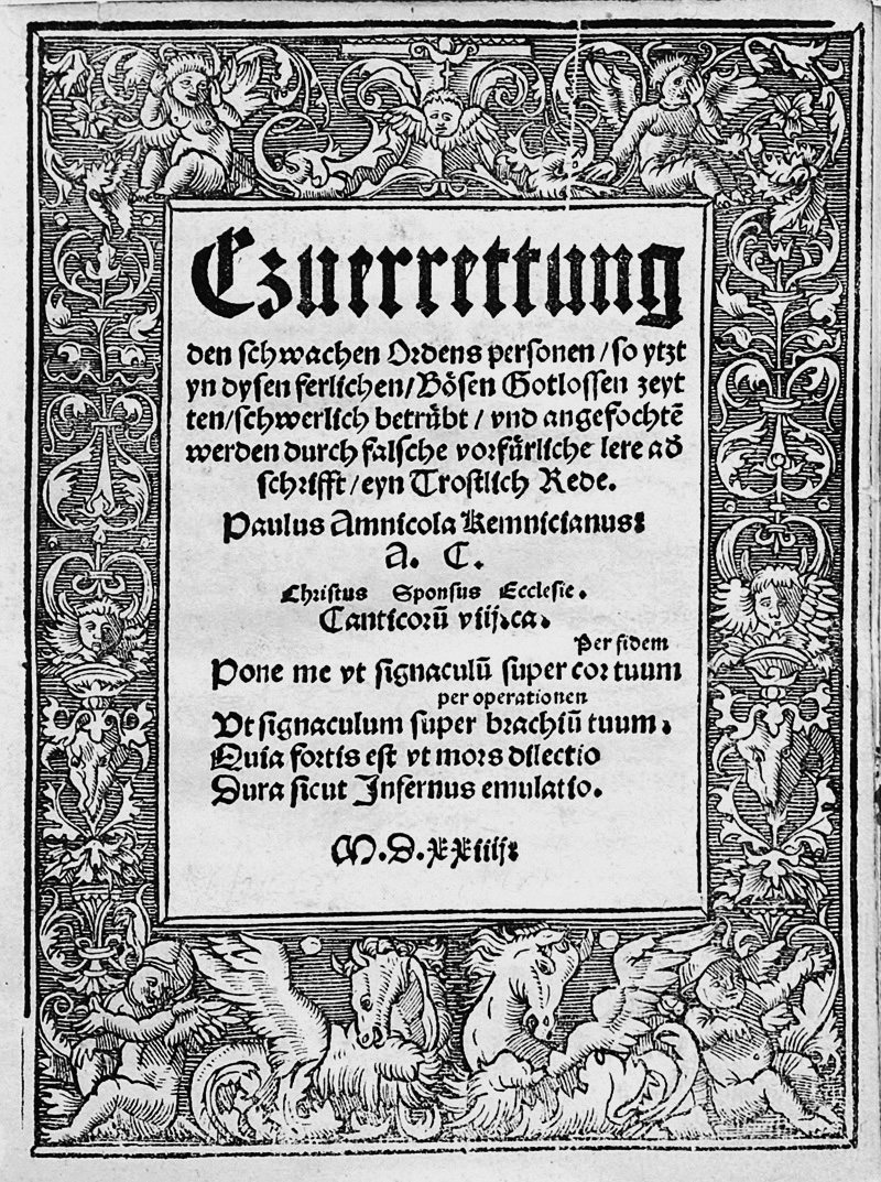 Bachmann, Paul. Czuerrettung den schwachen Ordens personen ... eyn Trostlich Rede. 51 Bl. Mit breiter Holzschnitt-Titelbordüre. 18,5 x 14 cm. Modernes Halbpergament mit goldgeprägtem Deckeltitel und Rotschnitt. (Dresden, Hieronymus Emser), 1524.