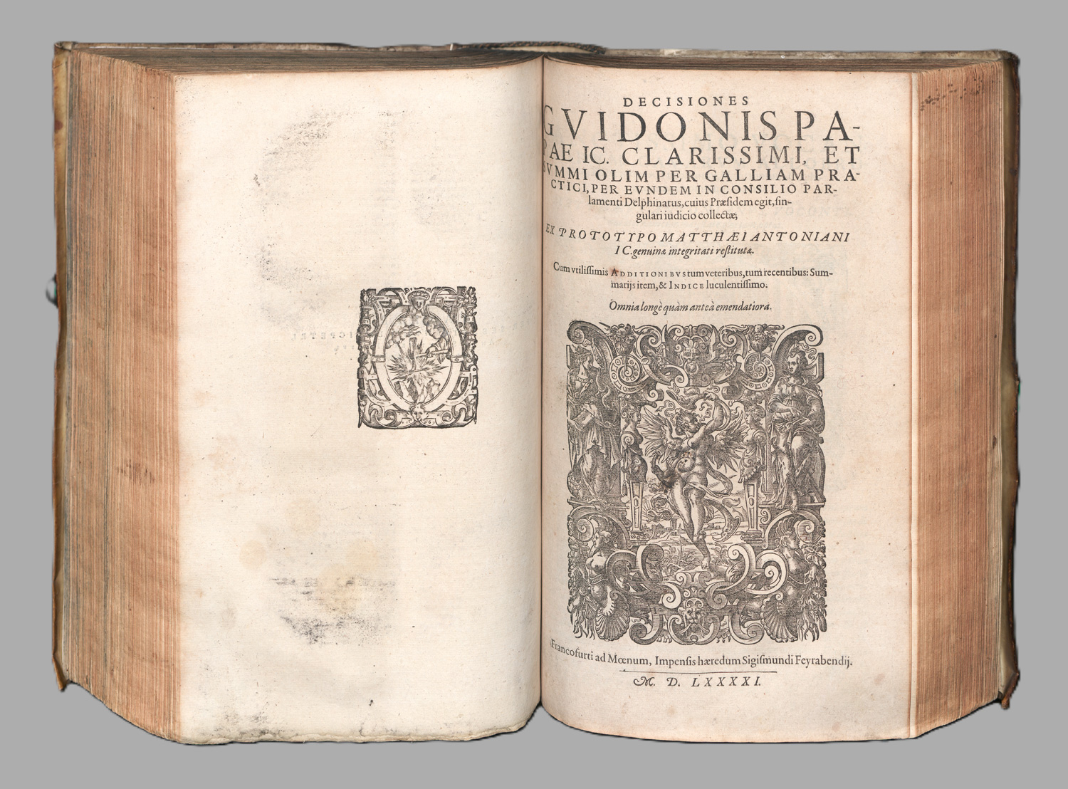 Der Autor Egidio Bossi (auch latinisiert unter Egidius Bossius; 1488-1546) war einer der wichtigsten italienischen Juristen seiner Zeit. Bei dem vorliegenden Druck aus der vornehmen Offizin des Basler Druckers Sebastian Henricpetri handelt es sich um den ersten und einzigen im deutschen Sprachraum bis 1600. – Gelegentlich etwas angestaubt, Knickspur und Bräunungen im Block, jedoch kaum fleckig, mit vereinzelten Témoins. – Beigebunden: Papa Guido (Guy de la Pape). Decisiones Guidonis Papae IC. clarissimi, et summi olim per Galiam parlamenti Delphinatus, cuius Praesidem egit, singulari iudicio collectae. Ex prototoype Matthaei Antoniani [...]. Cum utilissimis additionibus. 4 Bl., 404 S., 17 Bl. Mit großem Titelholzschnitt von Jobst Amman (monogrammiert im Stock "IA". - Frankfurt am Main, Sigmund Feyerabend, 1591. - VDF16 G 3177. Vgl. Graesse III, 180. "Les décisions de Guy-Pape ont été longtemps d'une grande autorité dans le pays de droit écrit [...]" (Brunet II, 1811). Stellenweise leicht gebräunt. - Vorsatz mit mehreren, teils ausgestrichenen Besitzvermerken, u. a. eines "Johannes Petrus Rheinfeld".