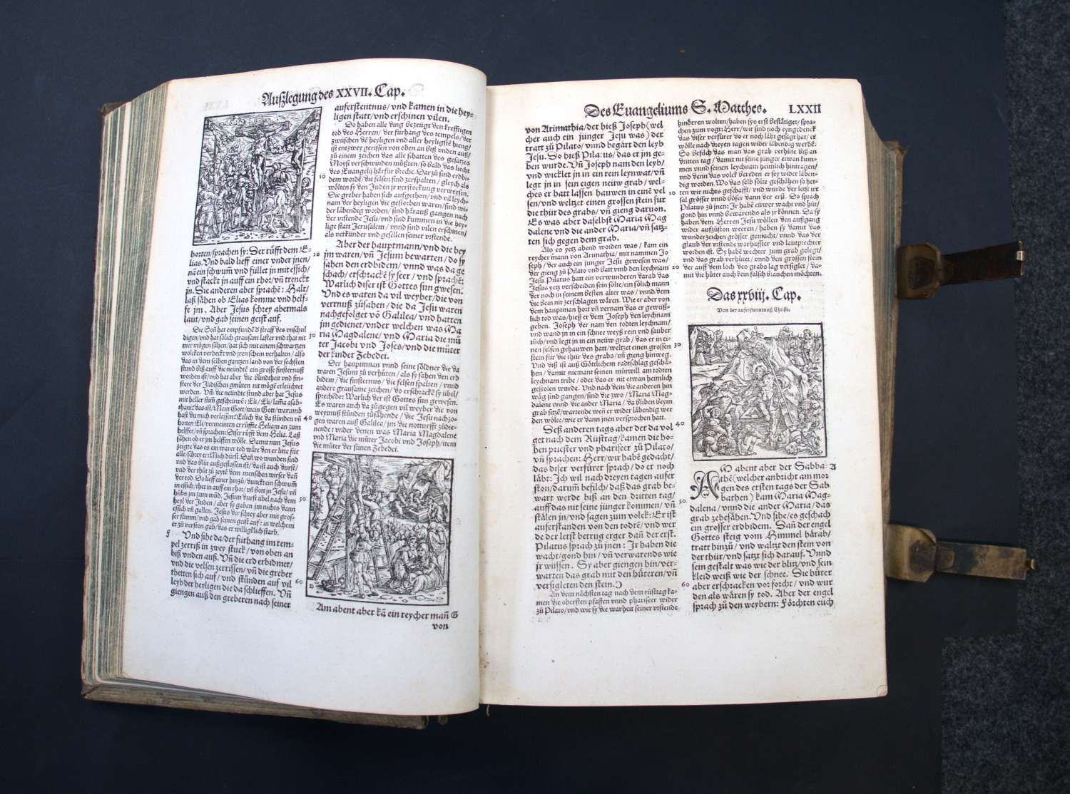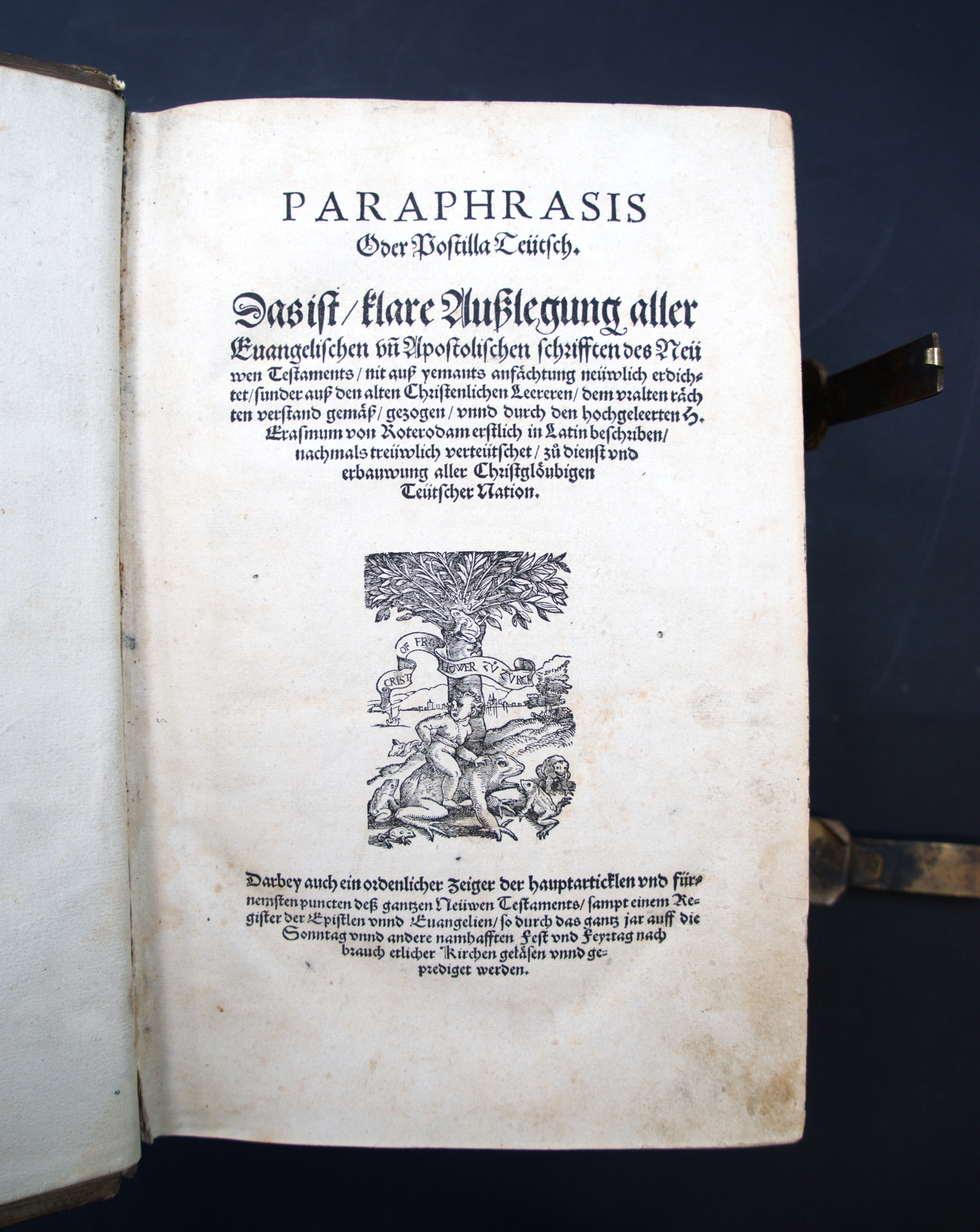 Erasmus von Rotterdam, Desiderius. Paraphrasis oder Postilla Teütsch. Das ist klare Außlegung aller Evanglischen unn Apostolischen Schrifften des Neuwen Testaments. 32 Bl., CCCCCXCIII num. Bl. Mit Holzschnitt-Druckermarke auf dem Titel und zahlreichen Text-Holzschnitten. 30,5 x 19,5 cm. Schweinsleder d. Z. (berieben, bestoßen und fleckig) über abgefasste Holzdeckel, fünf Bünden und mit zwei Messingschließen. (Zürich, Froschauer, 1552).