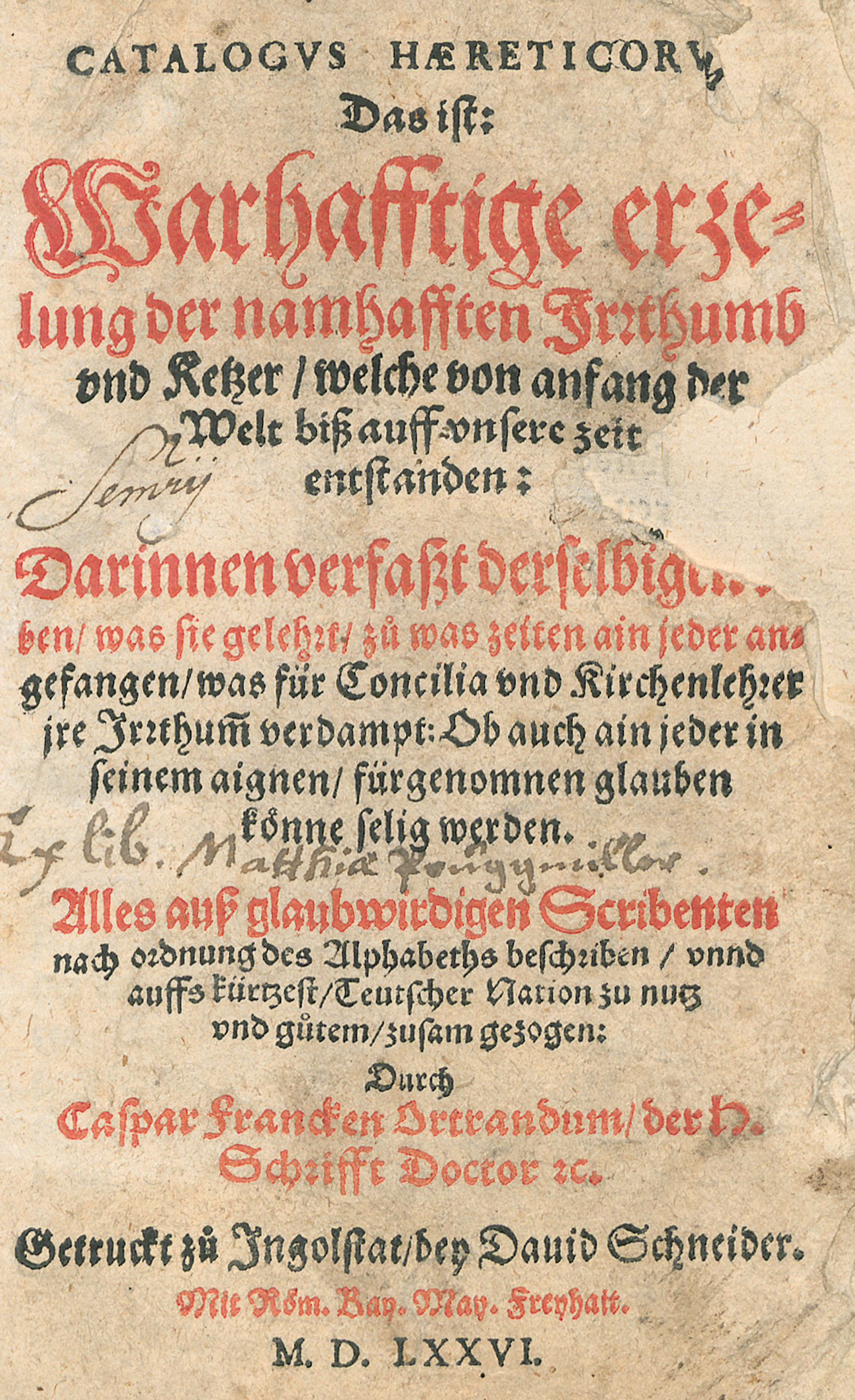 VD16 F 2037. Stalla 1321. Zischka 21. Nicht im STC und bei Adams. – Erste Ausgabe. Alphabetisches Verzeichnis von Ketzern, Sekten und Schwärmern. Der lutherische Prediger Caspar Franck (1520-1578) konvertierte 1568 zum katholischen Glauben. – Das Errata-Blatt fehlt. Titel mit hs. Besitzvermerk und Ausriss (wenig Textverlust). Das letzte Blatt oben zu etwa einem Drittel abgerissen (Textverlust). Etwas eselsohrig und fleckig.