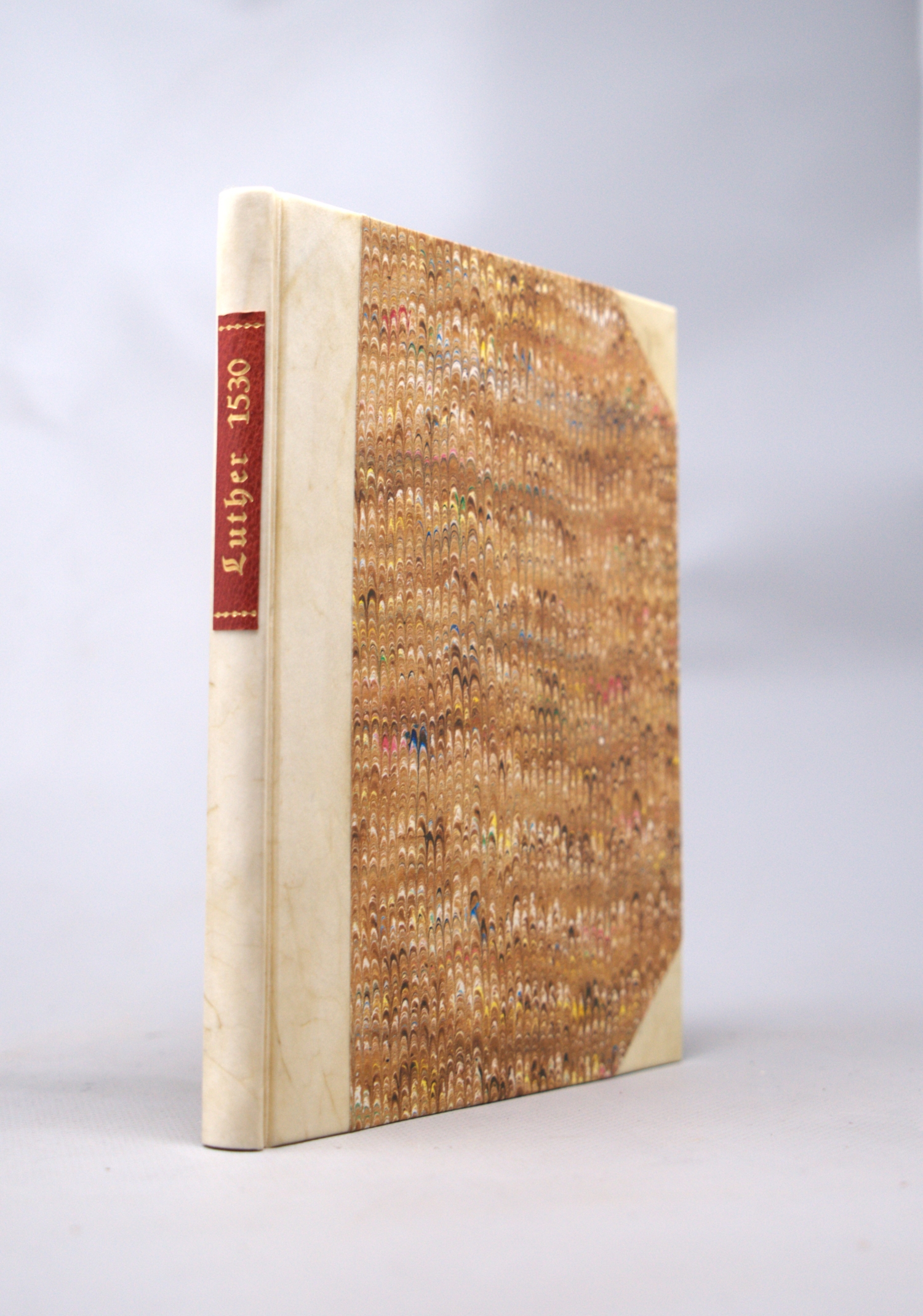 Luther, Martin. Das Siebenzehend Capitel Johannis, von dem gebete Christi. 74 Bl. Mit breiter Holzschnitt-Titelbordüre. 19,5 x 14,5 cm. Moderner marmorierter Halbpergamentband mit montiertem RSchild. Wittenberg, Hans Weiss, 1530.