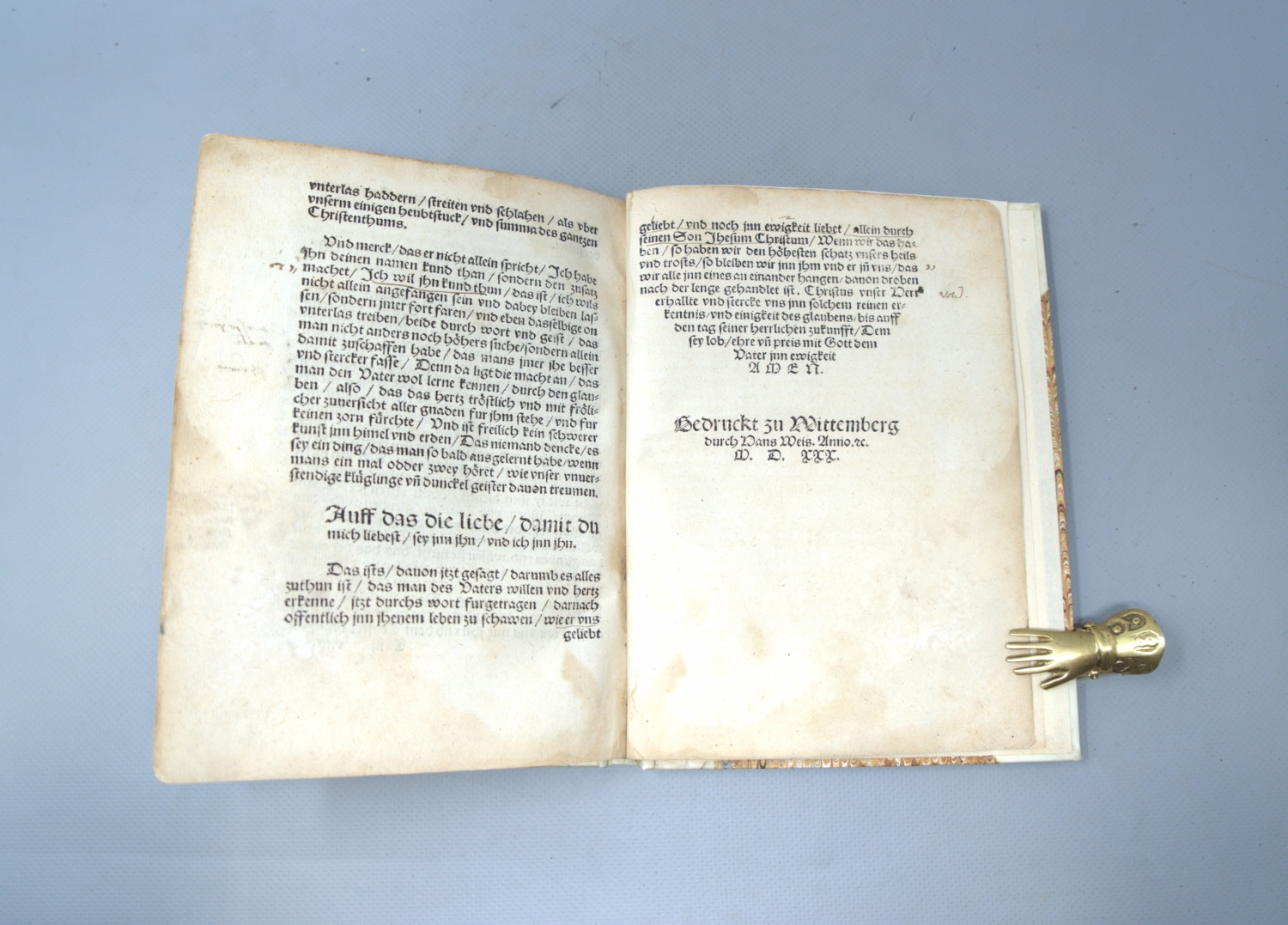 VD16 L 6690. Benzing 2753. Kuczynski 1720. Knaake 607 – Erste Ausgabe. Luthers Wochenpredigten über Kapitel XVII des Johannesevangeliums fanden 1528 und 1529 jeweils an Samstagabenden statt. Caspar Cruciger (1504-1548), der wahrscheinlich selbst Hörer war, edierte sie schliesslich auf Bitten Luthers und auf Grundlage der Aufzeichnungen Georg Rörers (1492-1558). Da die vorliegende Predigt vom Text Rörers erheblich abweicht, dürfte Cruciger noch auf andere Quellen, vermutlich auch auf seine eigene Mitschrift, zurückgegriffen haben. – Durchgehend mal mehr, mal weniger, teils auch stärker gebräunt, fleckig und feuchtrandig sowie mit einigen alten Annotationen.