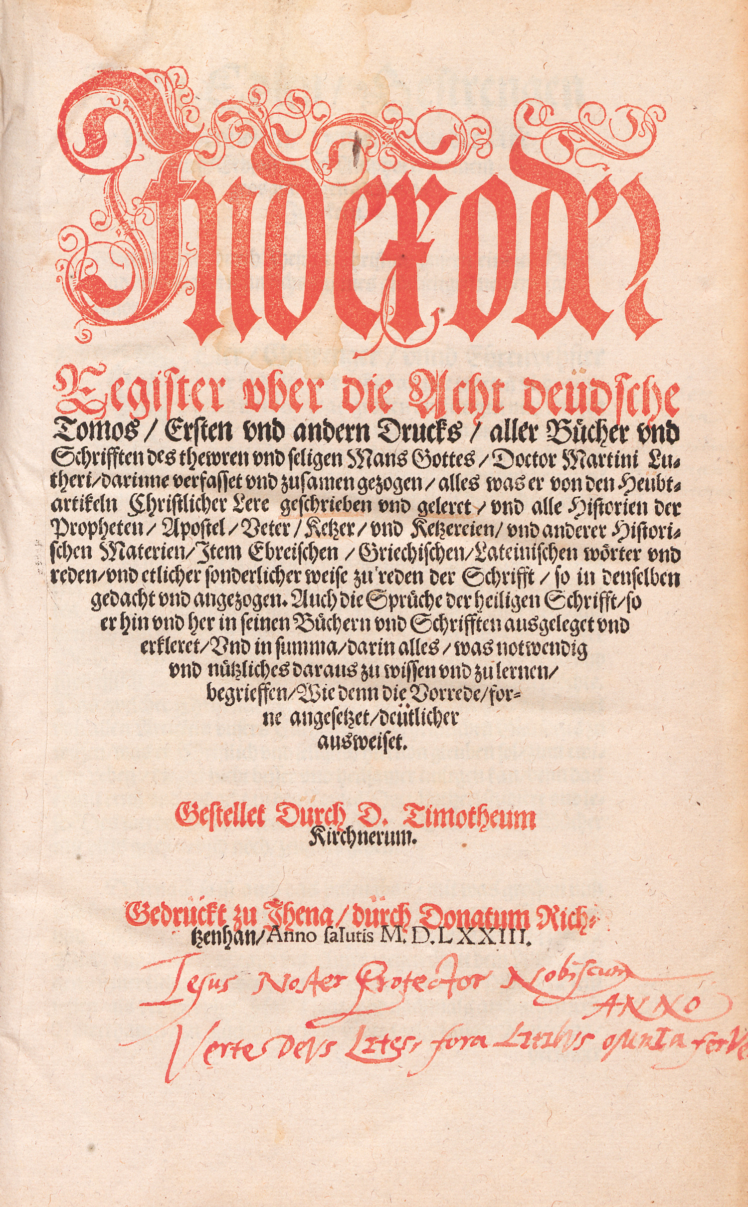 Luther, Martin. - Kirchner, Timotheus. Jndex oder Register uber die acht deudsche Tomos, ersten und andern Drucks, aller Bücher und Schrifften Doctor Martini Lutheri. 221 nn. Bl. Titel in Rot und Schwarz. 30,5 x 19 cm. Blindgeprägter Schweinslederband d. Z. (etwas fleckig, berieben und angeschnutzt) mit 2 intakten Messingschließen. Jena, Donat Richtzenhahn, 1573.