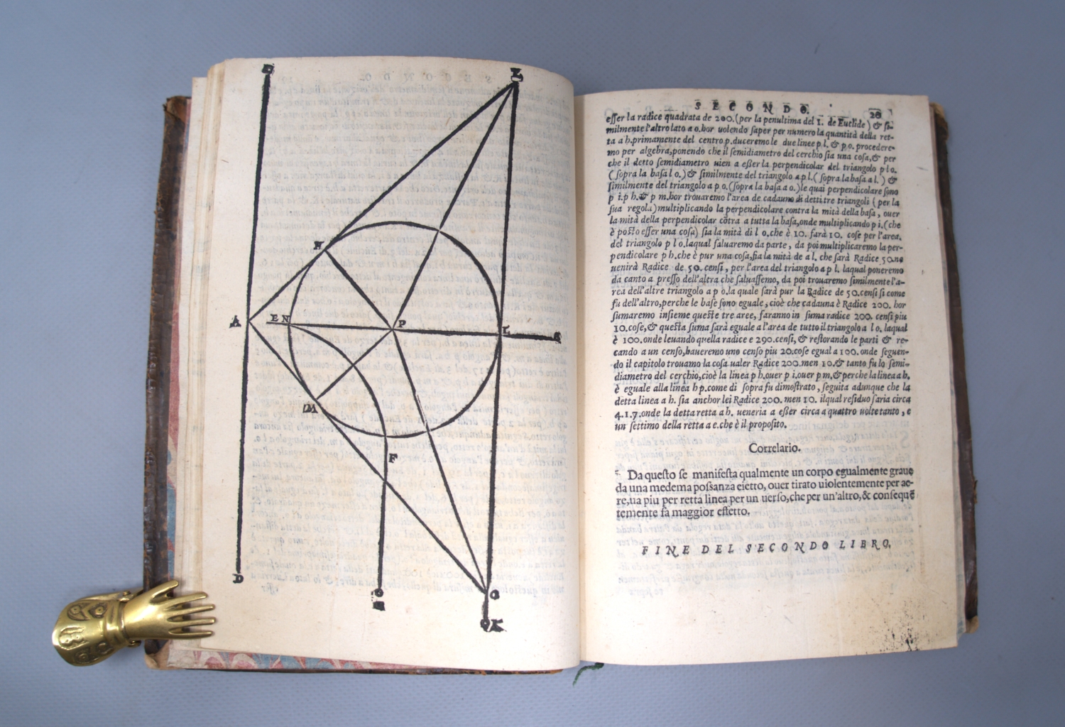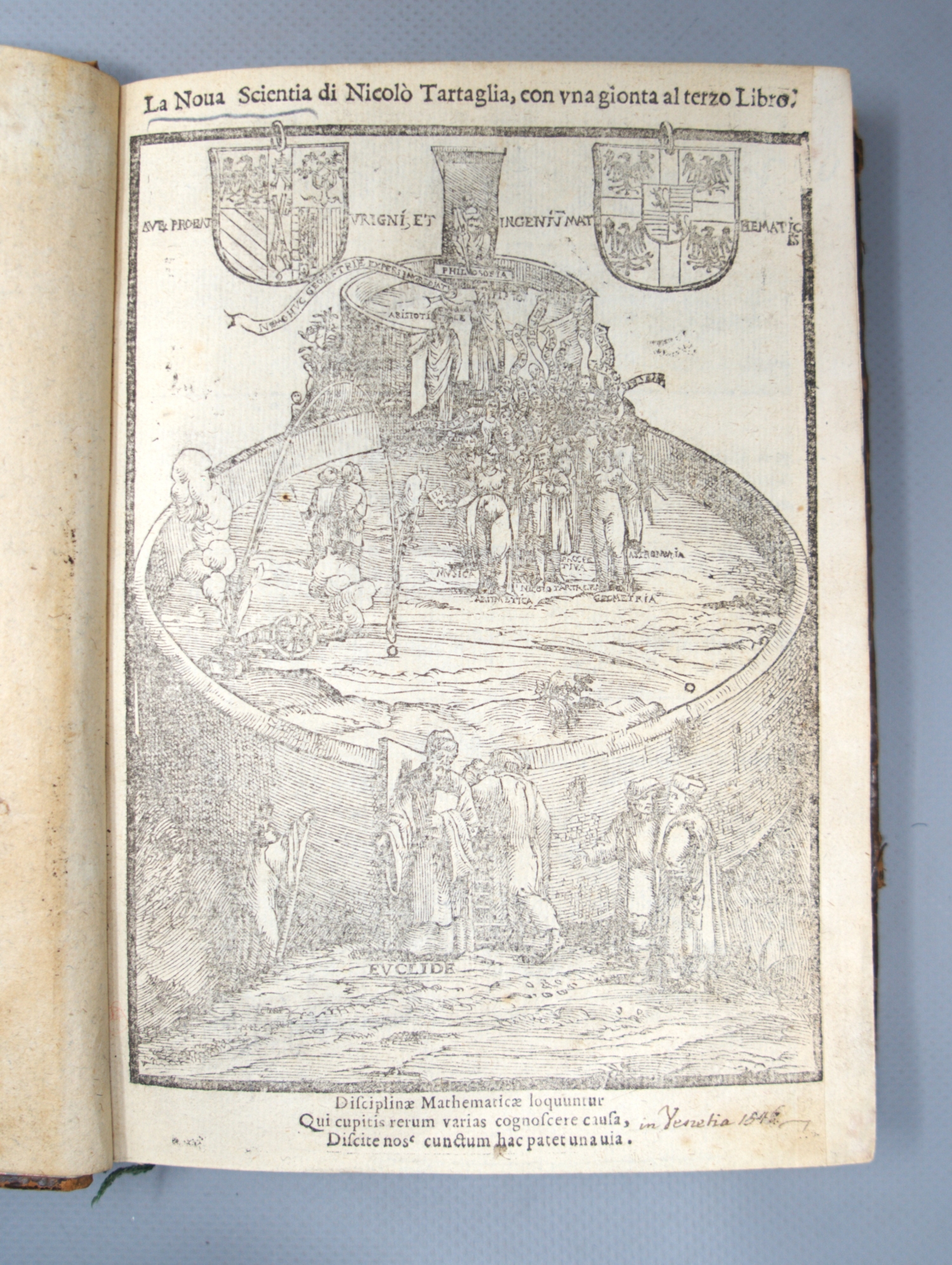 Das Titelblatt zeigt einen großformatigen Holzschnitt mit dem Wappen Francesco Maria II. della Roveres, Herzog von Urbino. Darunter eine beinahe ganzseitige allegorische Darstellung, in der Tartaglia im Zentrum verschiedener - weiblich personifizierter - Wissenschaftsdisziplinen erscheint, umgeben von Autoritäten der Antike wie Euklid, Aristoteles und Platon. – Innenspiegel mit zwei montierten Bibliotheksschildern (eines fast entfernt). Stockfleckig und papierbedingt gebräunt.