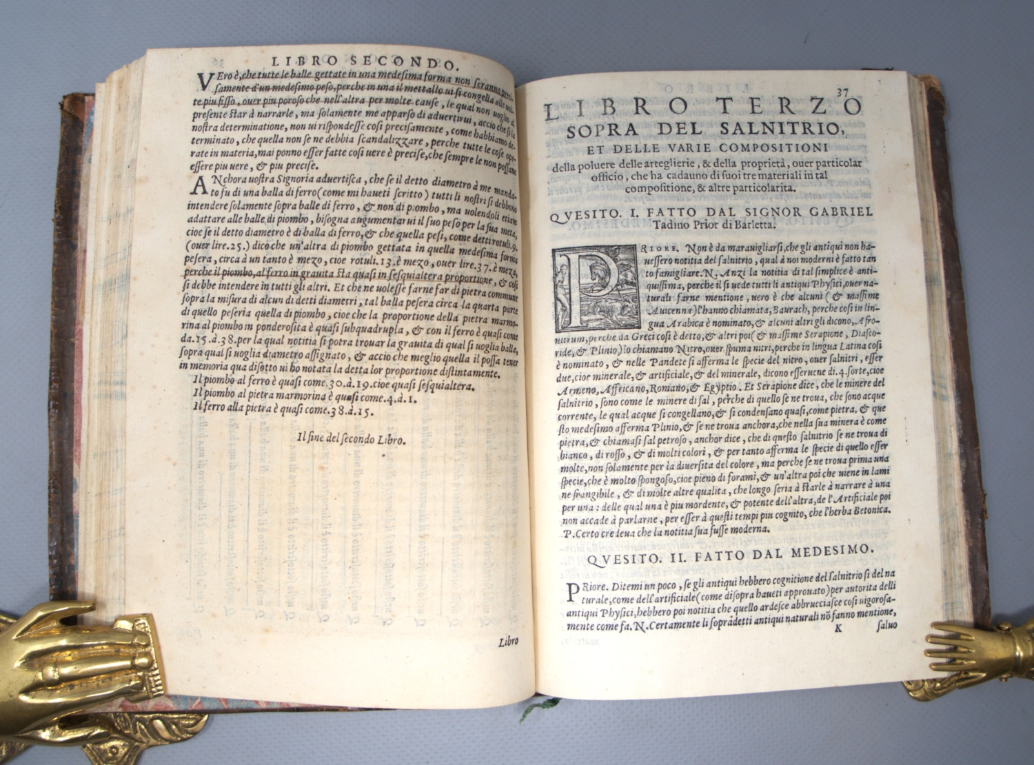 Nicht im KVK. Vgl. Poggendorff 1069 (Erstausgabe von 1537). – Reich illustrierte Ausgabe von Tartaglias (1499-1557) grundlegender Schrift "Nova Scientia", deren Erstdruck 1537 erschien. Es gilt als die erste veröffentlichte Abhandlung zur Ballistik überhaupt und ist somit ein Meilenstein der Bewegungslehre, die später zu den Erkenntnissen Galileis und anderer Wegbereiter führte.