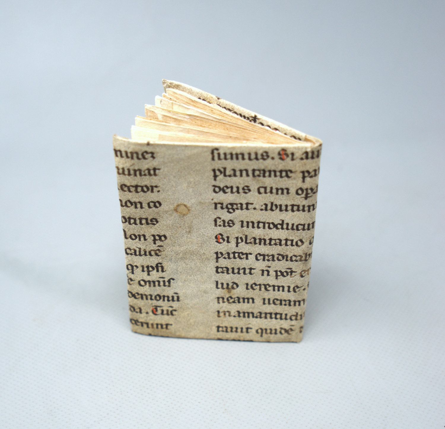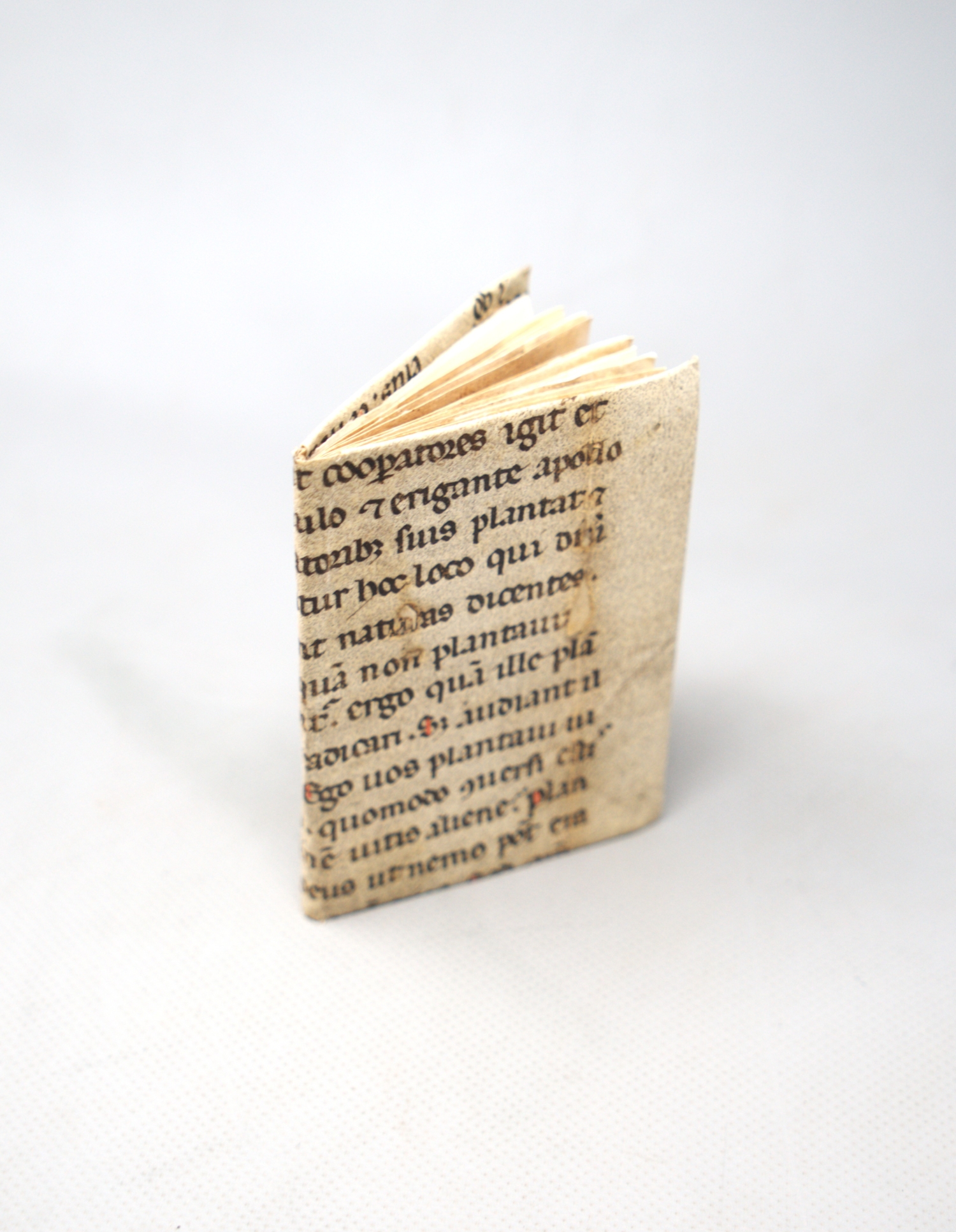 Der Inhalt folgt der etablierten Struktur der Krakauer Prognostica. Auf der Rückseite der Titelseite findet sich eine Erklärung der astrologischen und typographischen Zeichen. Es folgt ein ausführlicher Überblick über die wichtigsten lunarischen und planetarischen Konstellationen des Jahres, einschließlich der "glücklichen Zahl", günstigen und ungünstigen Tage sowie medizinischer Hinweise wie empfohlene Aderlasszeiten. Der eigentliche Kalender - der zentrale Teil des Büchleins - enthält für jeden Tag die liturgisch relevanten Heiligenfeste, die Mondposition im Tierkreis sowie die bedeutenden planetarischen Aspekte. Kurze Versmaximen beschließen jeden Monat. Das letzte Blatt zeigt ein Diagramm der für 1536 erwarteten Mondfinsternisse mit erklärendem Text sowie das Impressum "In Cracovia, anno Domini 1536". – Das Exemplar wurde ursprünglich als Einbandmakulatur in einem historischen Band genutzt und später vorsichtig entnommen und konserviert. Spuren dieser früheren Verwendung - vereinzelt Klebstoffreste und kleine Randverluste, mehrere Wurmschäden und einige Ausrisse bzw. Löcher und Fehlstellen durch Abrieb (teilweise mit Text und Bildverlusten, meist von den äußeren Rändern her), fleckig, gebräunt und teils mit Randansetzungen und Füllungen sorgsam restauriert. Die Holzschnitte sind insgesamt gut erhalten; kleinere Randverluste an einigen äußeren Rahmen - durch die frühere Verwendung als Einbandmaterial - wurden fachkundig verstärkt und beeinträchtigen weder Lesbarkeit noch Gesamteindruck. - sind noch sichtbar, wurden aber durch Faservestärkung professionell stabilisiert. Alle Blätter sind vollständig, der Druck ist klar, und das Papier hat seine frische Anmutung bewahrt. Heute ist das Werk in ein einzelnes Pergamentfragment des 12. oder 13. Jahrhunderts gebunden, geschrieben in regelmäßiger Rotunda und enthaltend einen Teil des Hieronymus-Kommentars zu Matthäus 15 - ein typisches, historisch stimmiges Beispiel mittelalterlicher Handschriftenmakulatur.