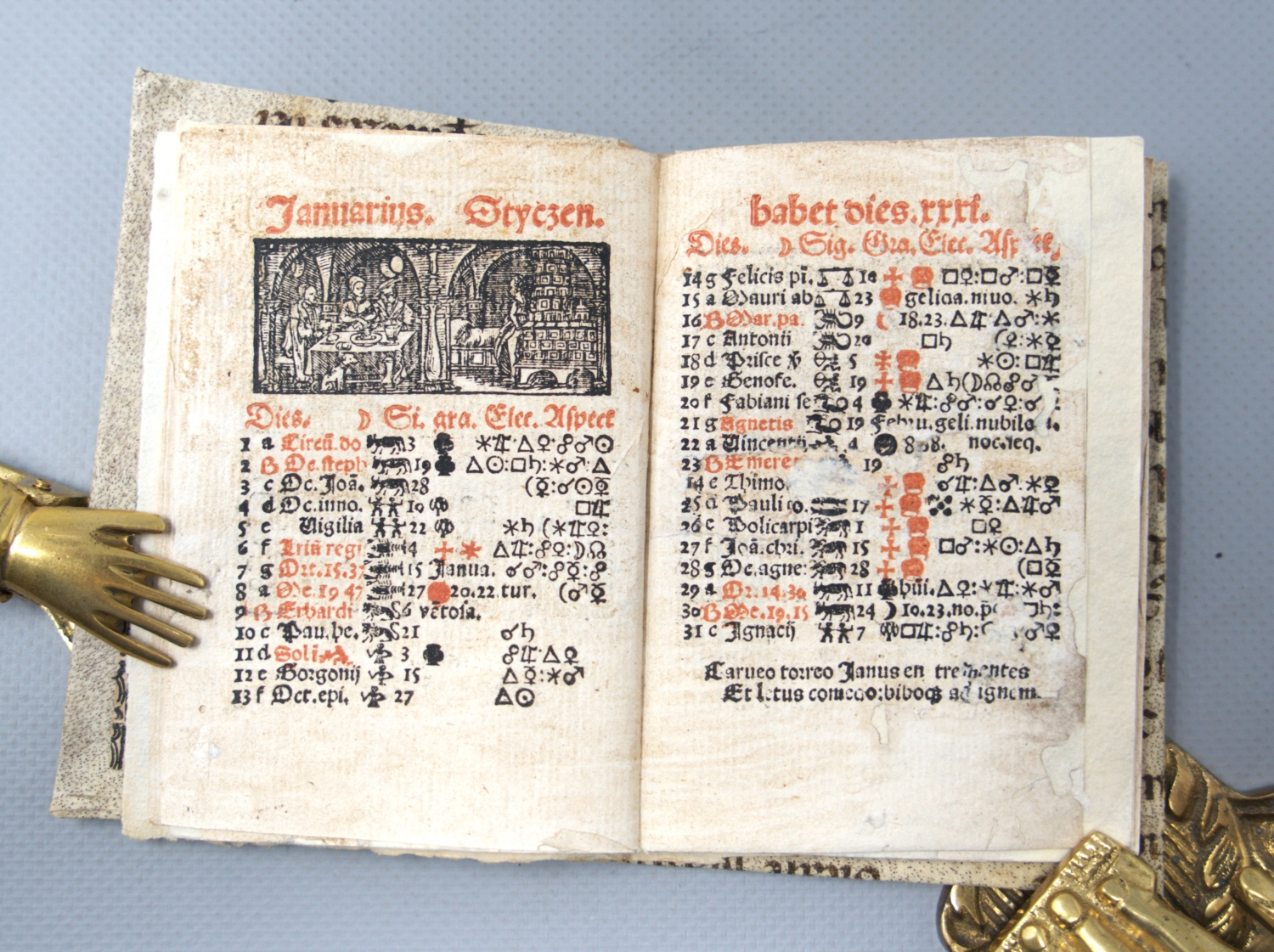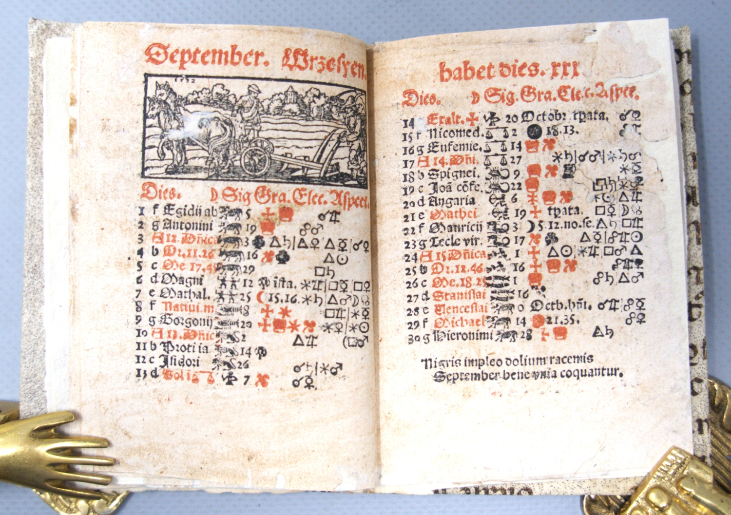 Hübsches kleines Kalendarium mit dem Titel "Ephemeridiarium", einer Zusammensetzung aus "Ephemerides" (Zeitberechnung auf Basis der Positionsbestimmungen von Himmelskörpern) und und "Diarium" (Kalender mit Mondphasen, Zodiakus etc.). Nach der "Configurationum Lune cum Sole et planetis ennaratio" folgen die Monate in lateinische und polnischer Sprache "Januarius. Styczeń. habet dies.xxxi.", "Februarius. Luty. habet dies.xxix." etc. Die kleinen Querholzschnitte zeigen typische, den Jahreszeiten zugeordnete Szenen wie Eggen, Aussaat, Mähnen, Pflügen, Weinkeltern, Jagd und winterliches Festmahl. Darunter jeweils der Heiligenkalender mit den prominenten Heiligen der römisch-katholischen Kirche, aber auch vielen polnischen Lokalheiligen wie dem Heiligen Adalbert von Prag (23. April), Stanislaus von Krakau (8. Mai) etc.