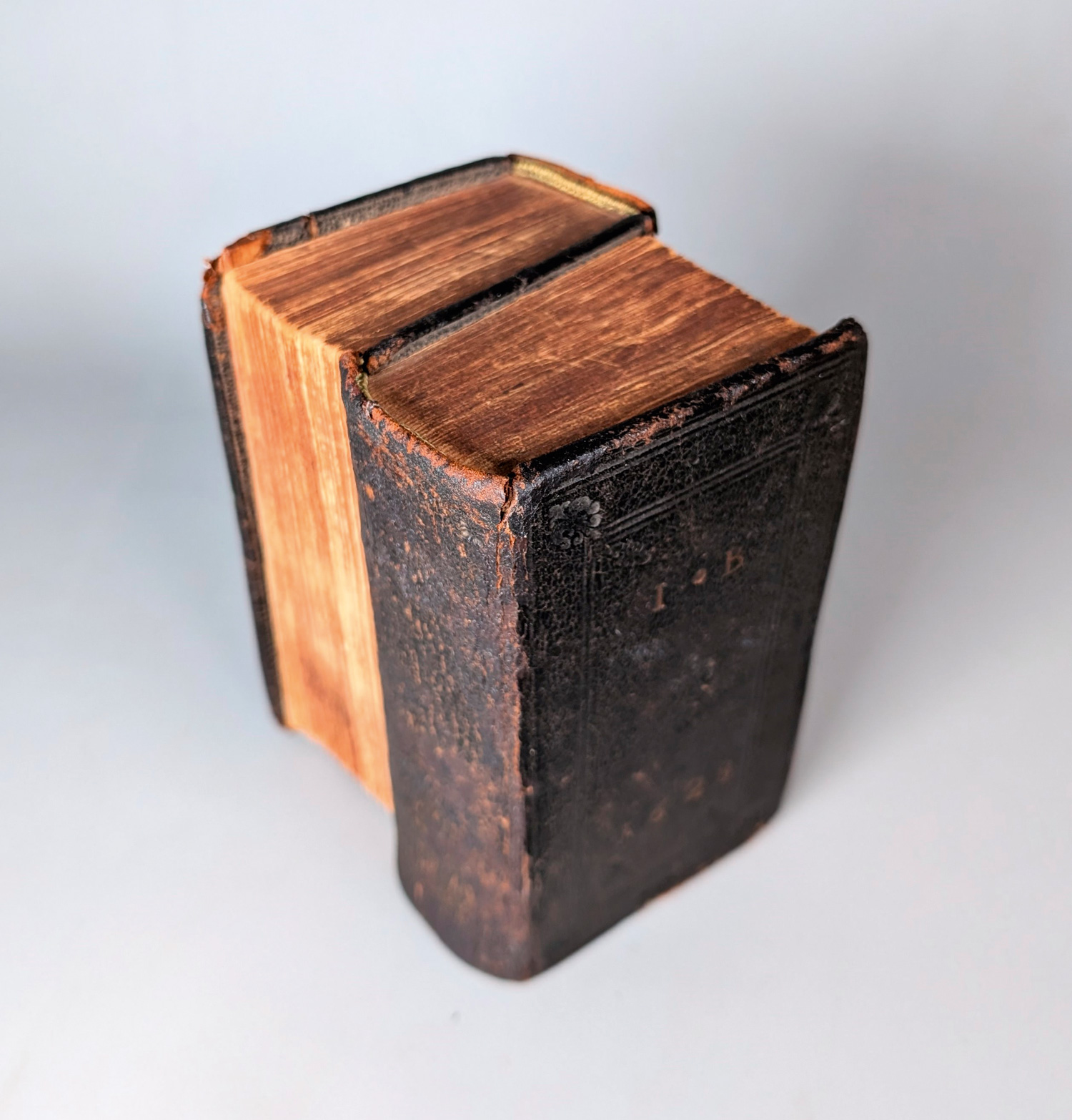 Biblia germanica. - Biblia das ist die gantze Heilige Schrift Deutsch: D. Mart. Luthers. 48 Bl., 408 S.; 1 Bl., 542 S.; 1 Bl. 590 S.; 1 Bl., 426 S., 4 Bl. Mit gestochenem Frontispiz, Kupfertitel, 3 Holzschnitt-Bordüren und 1 Holzschnitt-Druckermarke. 14 x 7 cm. Leder d. Z. (bestoßen, wenige Wurmlöcher, Leder etwas brüchig) als Dos-à-Dos-Einband mit Blindprägungen und Datierung "1628" auf den Deckeln. Lüneburg, Stern, 1627.