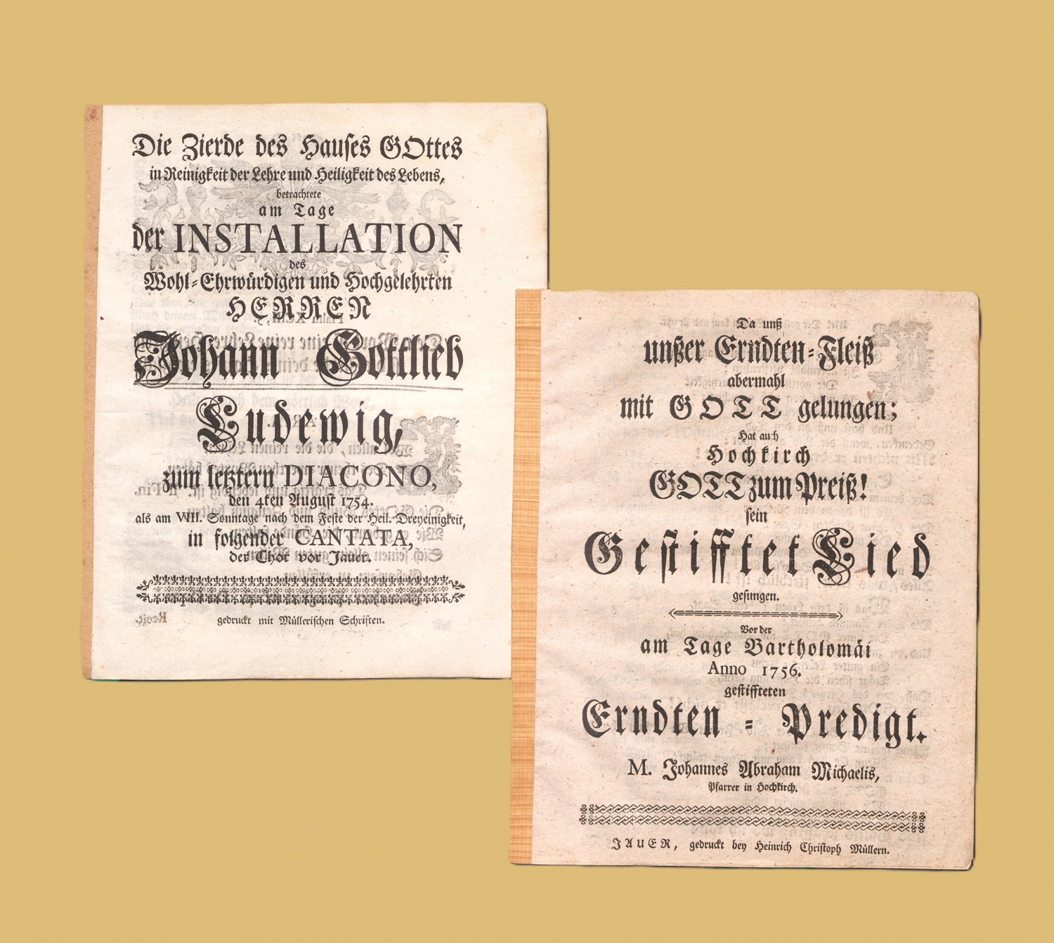 Seltene Kirchenlieder, die in Jauer gedruckt wurden. Vorhanden sind: I. Die Zierde des Hauses Gottes in Reinigkeit der Lehre und Heiligkeit des Lebens, betrachtete am Tage der Installation des wohl-ehrwürdigen und hochgelehrten Herren Johann Gottlieb ... Mit Holzschnitt-Kopfvignette. 4. August 1754. - II. Da unß unßer Erndten-Fleiß abermahl mit Gott gelungen; hat auch Hochkirch Gott zum Preiß sein gestifftet Lied gesungen. 1756. – Papierbedingt gebräunt, minimal gebräunt und leicht knickspurig.